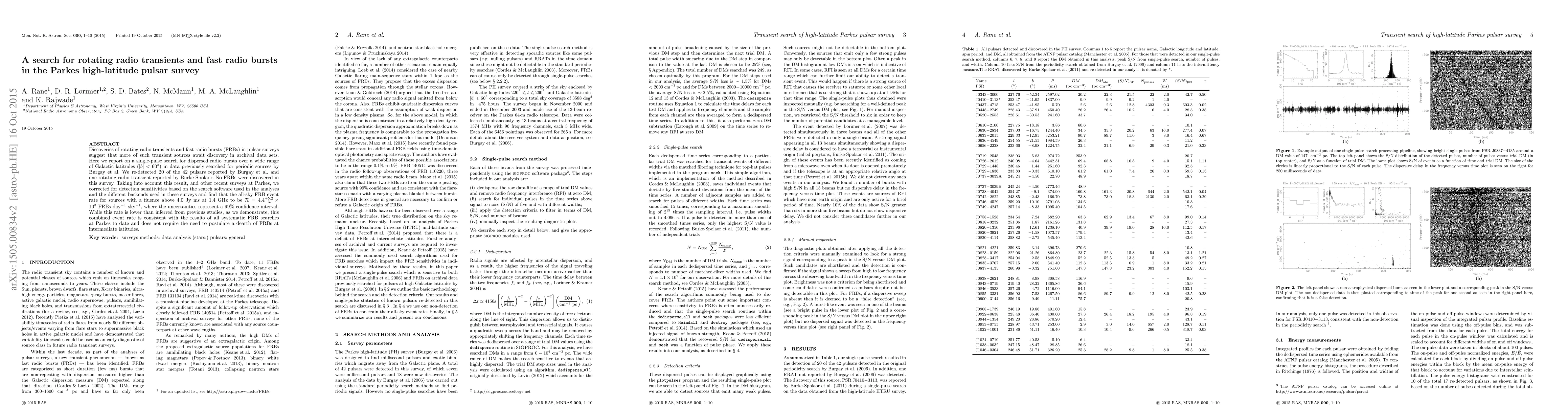 This paper reports on a search for rotating radio transients and fast radio bursts in the Parkes high-latitude pulsar survey, finding no new FRBs but re-detecting 20 pulsars and one transient. The study estimates an all-sky FRB event rate of ${\cal R} = 4.4^{+5.2}_{-3.1} \times 10^3$ FRBs day$^{-1}$ sky$^{-1}$ for fluences above 4.0 Jy ms at 1.4 GHz.