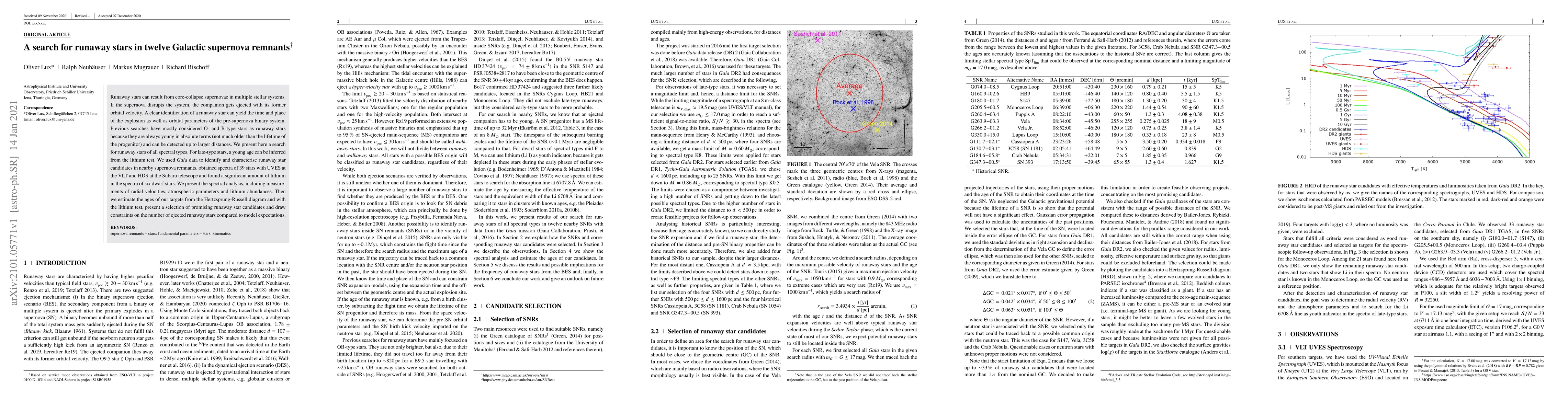 Runaway stars can result from core-collapse supernovae in multiple stellar systems. If the supernova disrupts the system, the companion gets ejected with its former orbital velocity. A clear identification of a runaway star can yield the time and place of the explosion as well as orbital parameters of the pre-supernova binary system. Previous searches have mostly considered O- and B-type stars as runaway stars because they are always young in absolute terms (not much older than the lifetime of the progenitor) and can be detected up to larger distances. We present here a search for runaway stars of all spectral types. For late-type stars, a young age can be inferred from the lithium test. We used Gaia data to identify and characterise runaway star candidates in nearby supernova remnants, obtained spectra of 39 stars with UVES at the VLT and HDS at the Subaru telescope and found a significant amount of lithium in the spectra of six dwarf stars. We present the spectral analysis, including measurements of radial velocities, atmospheric parameters and lithium abundances. Then we estimate the ages of our targets from the Hertzsprung-Russell diagram and with the lithium test, present a selection of promising runaway star candidates and draw constraints on the number of ejected runaway stars compared to model expectations.