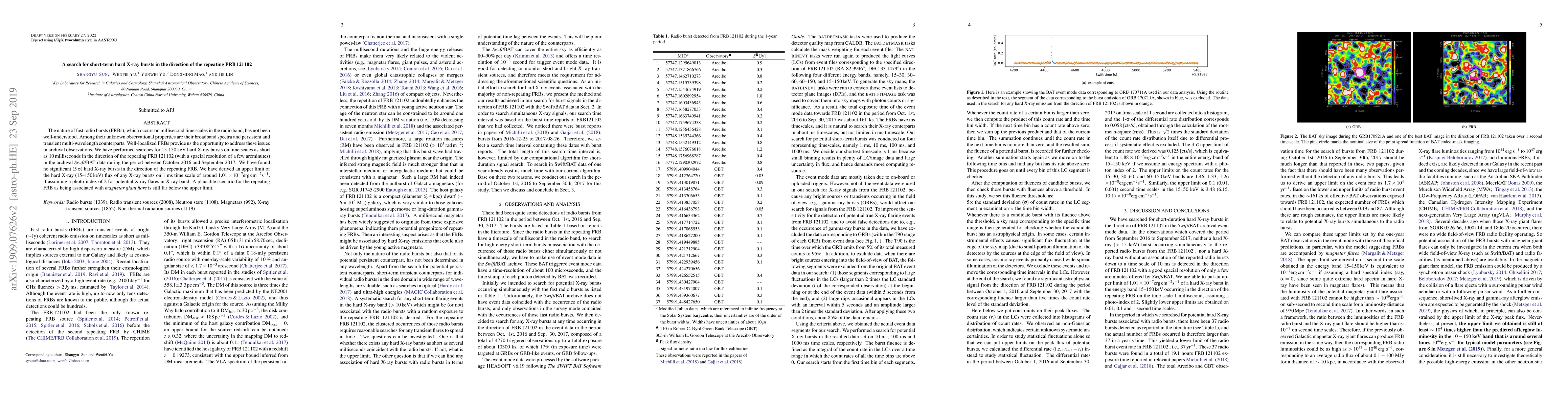 Researchers searched for short-term hard X-ray bursts near repeating FRB 121102 but found none, setting an upper limit of $1.01 imes 10^{-7}$ erg cm$^{-2}$s$^{-1}$. This result suggests that magnetar giant flares may be a plausible explanation for the repeating FRB.