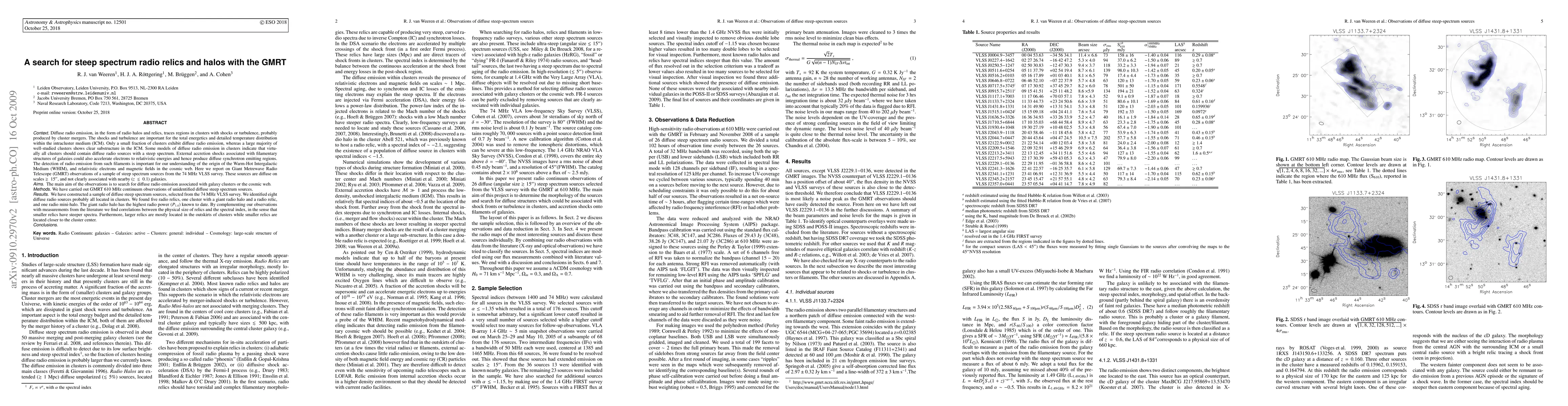 Context: Diffuse radio emission, in the form of radio halos and relics, traces regions in clusters with shocks or turbulence, probably produced by cluster mergers. Some models of diffuse radio emission in clusters indicate that virtually all clusters should contain diffuse radio sources with a steep spectrum. External accretion shocks associated with filamentary structures of galaxies could also accelerate electrons to relativistic energies and hence produce diffuse synchrotron emitting regions. Here we report on Giant Metrewave Radio Telescope (GMRT) observations of a sample of steep spectrum sources from the 74 MHz VLSS survey. These sources are diffuse and not associated with nearby galaxies. Aims: The main aim of the observations is to search for diffuse radio emission associated with galaxy clusters or the cosmic web. Methods: We carried out GMRT 610 MHz continuum observations of unidentified diffuse steep spectrum sources. Results: We have constructed a sample of diffuse steep spectrum sources, selected from the 74 MHz VLSS survey. We identified eight diffuse radio sources probably all located in clusters. We found five radio relics, one cluster with a giant radio halo and a radio relic, and one radio mini-halo. By complementing our observations with measurements from the literature we find correlations between the physical size of relics and the spectral index, in the sense that smaller relics have steeper spectra. Furthermore, larger relics are mostly located in the outskirts of clusters while smaller relics are located closer to the cluster center.