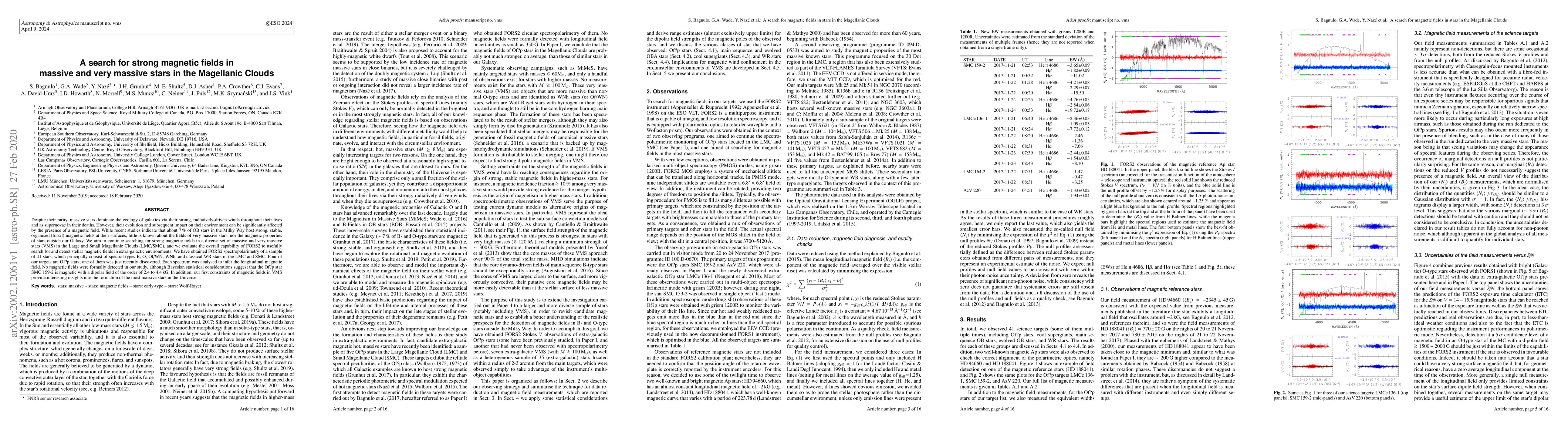 Despite their rarity, massive stars dominate the ecology of galaxies via their strong, radiatively-driven winds throughout their lives and as supernovae in their deaths. However, their evolution and subsequent impact on their environment can be significantly affected by the presence of a magnetic field. While recent studies indicate that about 7% of OB stars in the Milky Way host strong, stable, organised (fossil) magnetic fields at their surfaces, little is known about the fields of very massive stars, nor the magnetic properties of stars outside our Galaxy. We aim to continue searching for strong magnetic fields in a diverse set of massive and very massive stars (VMS) in the Large and Small Magellanic Clouds (LMC/SMC), and we evaluate the overall capability of FORS2 to usefully search for and detect stellar magnetic fields in extra-galactic environments. We have obtained FORS2 spectropolarimetry of a sample of 41 stars, which principally consist of spectral types B, O, Of/WN, WNh, and classical WR stars in the LMC and SMC. Four of our targets are Of?p stars; one of them was just recently discovered. Each spectrum was analysed to infer the longitudinal magnetic field. No magnetic fields were formally detected in our study, although Bayesian statistical considerations suggest that the Of?p star SMC159-2 is magnetic with a dipolar field of the order of 2.4 to 4.4kG. In addition, our first constraints of magnetic fields in VMS provide interesting insights into the formation of the most massive stars in the Universe.