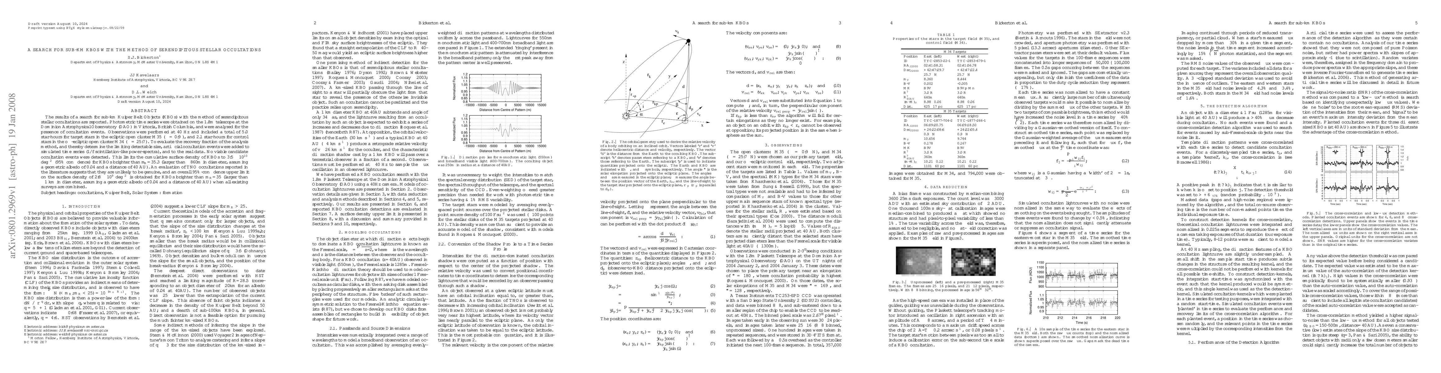 The results of a search for sub-km Kuiper Belt Objects (KBOs) with the method of serendipitous stellar occultations are reported. Photometric time series were obtained on the 1.8m telescope at the Dominion Astrophysical Observatory (DAO) in Victoria, BC, and were analyzed for the presence of occultation events. Observations were performed at 40 Hz and included a total of 5.0 star-hours for target stars in the ecliptic open cluster M35 (beta=0.9deg), and 2.1 star-hours for control stars in the off-ecliptic open cluster M34 (beta=25.7deg). To evaluate the recovery fraction of the analysis method, and thereby determine the limiting detectable size, artificial occultation events were added to simulated time series (1/f scintillation-like power-spectra), and to the real data. No viable candidate occultation events were detected. This limits the cumulative surface density of KBOs to 3.5e10 deg^{-2} (95% confidence) for KBOs brighter than m_R=35.3 (larger than ~860m in diameter, assuming a geometric albedo of 0.04 and a distance of 40 AU). An evaluation of TNO occultations reported in the literature suggests that they are unlikely to be genuine, and an overall 95%-confidence upper limit on the surface density of 2.8e9 deg^{-2} is obtained for KBOs brighter than m_R=35 (larger than ~1 km in diameter, assuming a geometric albedo of 0.04 and a distance of 40 AU) when all existing surveys are combined.