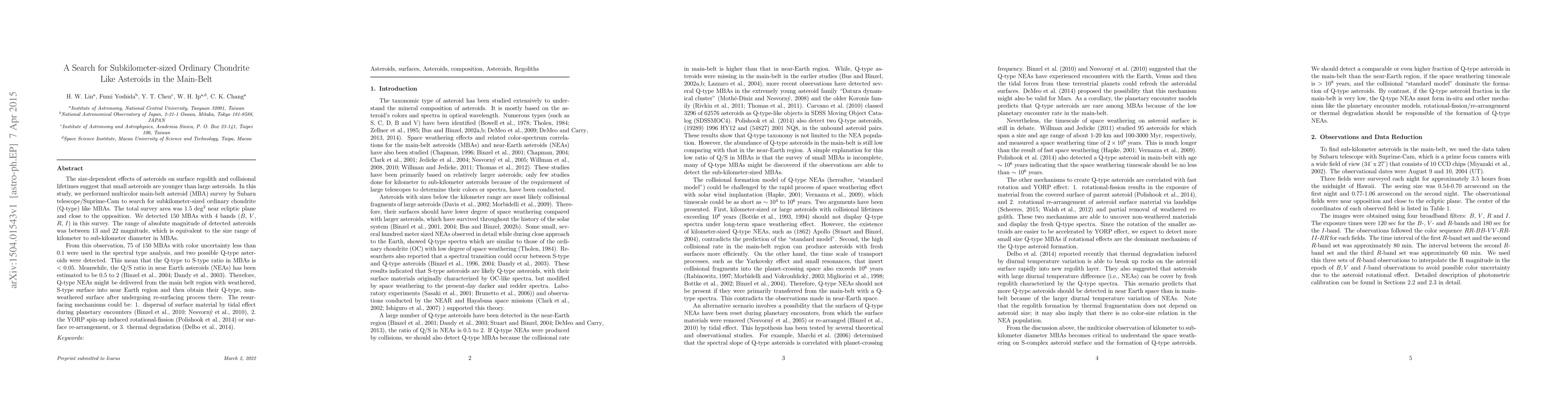 This study conducted a multicolor survey of main-belt asteroids using the Subaru telescope to identify subkilometer-sized ordinary chondrite-like asteroids. The survey detected 150 asteroids, revealing a Q-type to S-type ratio of less than 0.05 in the main belt, suggesting that Q-type asteroids may undergo resurfacing processes in near Earth regions.