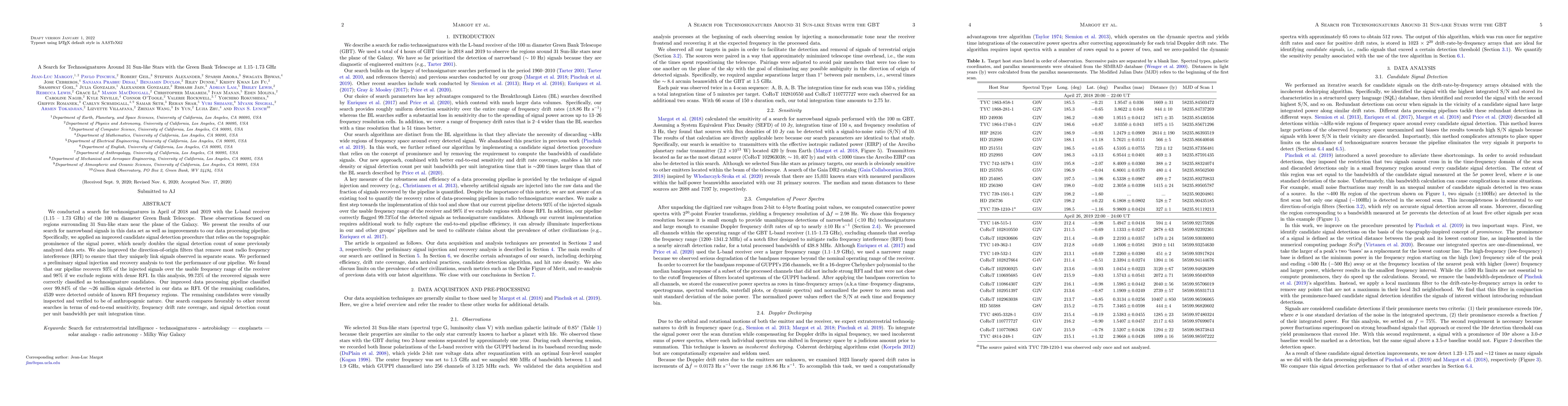 A search for technosignatures was conducted around 31 Sun-like stars using the Green Bank Telescope, recovering 99.73% of injected signals as candidates and detecting over 4539 potential anthropogenic signals.
