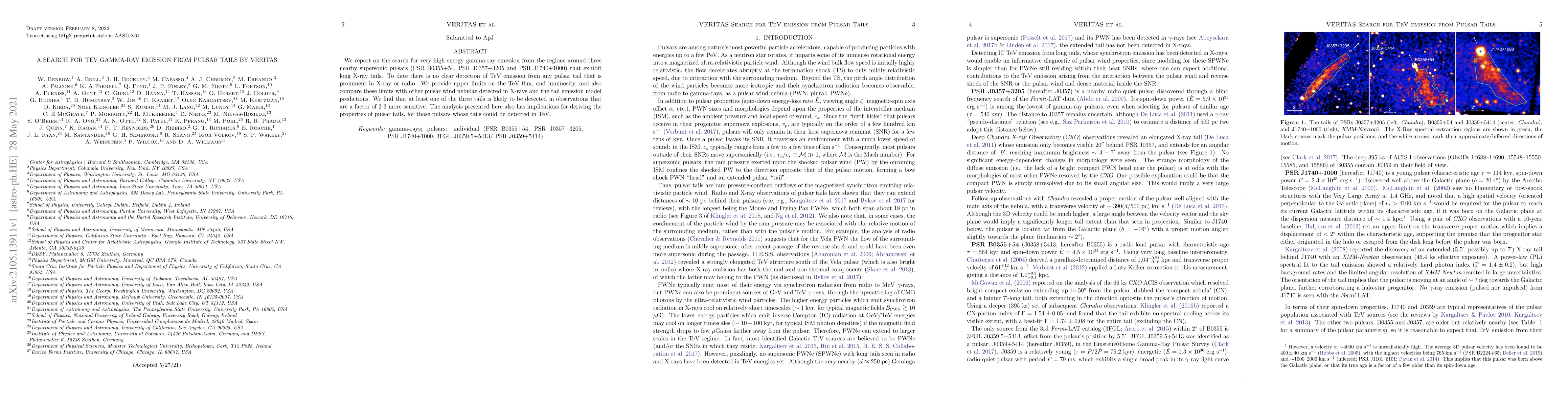This paper reports on the search for very-high-energy gamma-ray emissions from pulsar tails using the VERITAS telescope, finding no clear detections but providing upper limits on TeV flux and luminosity. The study suggests that future, more sensitive observations could detect at least one of the three pulsar tails.