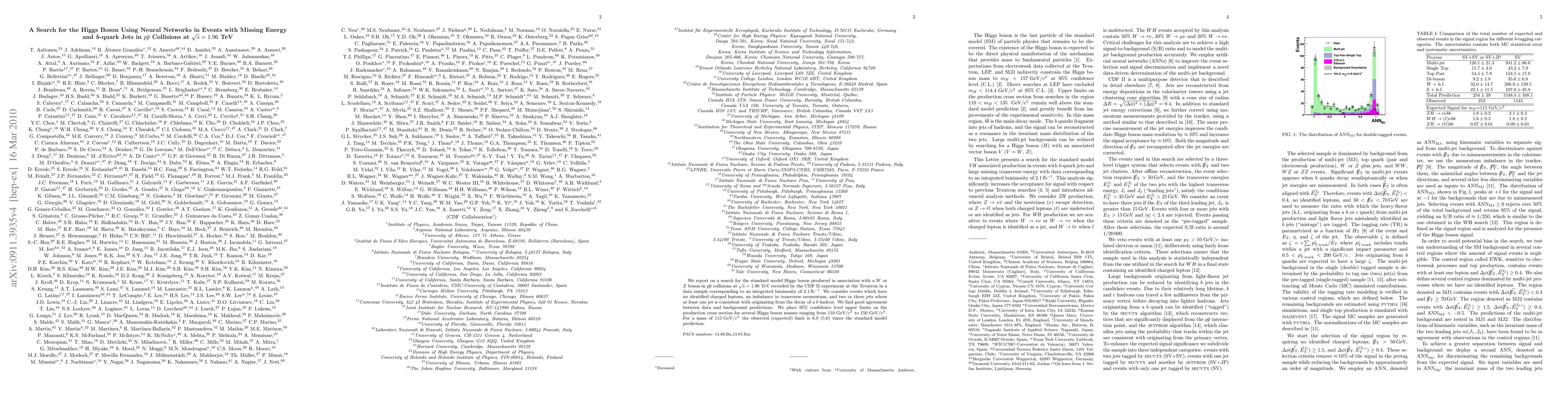 This study uses neural networks to search for the Higgs boson in $p\bar{p}$ collisions at $\sqrt{s}=1.96$ TeV with missing energy and $b$-quark jets, finding good data-prediction agreement and setting upper limits on the production cross section for Higgs masses from 110 to 150 GeV.