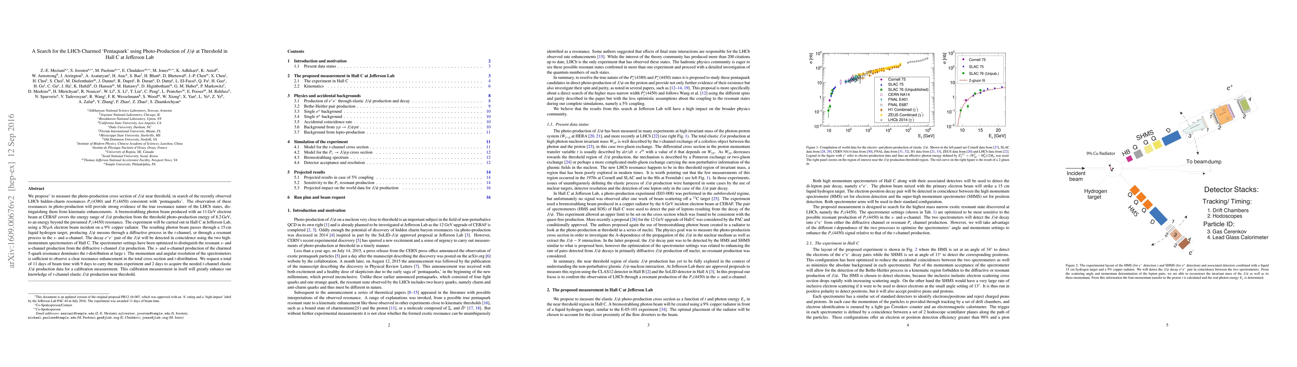 We propose to measure the photo-production cross section of $J/{\psi}$ near threshold, in search of the recently observed LHCb hidden-charm resonances $P_c$(4380) and $P_c$(4450) consistent with 'pentaquarks'. The observation of these resonances in photo-production will provide strong evidence of the true resonance nature of the LHCb states, distinguishing them from kinematic enhancements. A bremsstrahlung photon beam produced with an 11 GeV electron beam at CEBAF covers the energy range of $J/{\psi}$ production from the threshold photo-production energy of 8.2 GeV, to an energy beyond the presumed $P_c$(4450) resonance. The experiment will be carried out in Hall C at Jefferson Lab using a 50{\mu}A electron beam incident on a 9% copper radiator. The resulting photon beam passes through a 15 cm liquid hydrogen target, producing $J/{\psi}$ mesons through a diffractive process in the $t$-channel, or through a resonant process in the $s$- and $u$-channel. The decay $e^+e^-$ pair of the $J/{\psi}$ will be detected in coincidence using the two high-momentum spectrometers of Hall C. The spectrometer settings have been optimized to distinguish the resonant $s$- and $u$-channel production from the diffractive $t$-channel $J/{\psi}$ production. The $s$- and $u$-channel production of the charmed 5-quark resonance dominates the $t$-distribution at large $t$. The momentum and angular resolution of the spectrometers is sufficient to observe a clear resonance enhancement in the total cross section and $t$-distribution. We request a total of 11 days of beam time with 9 days to carry the main experiment and 2 days to acquire the needed $t$-channel elastic $J/{\psi}$ production data for a calibration measurement. This calibration measurement in itself will greatly enhance our knowledge of $t$-channel elastic $J/{\psi}$ production near threshold.