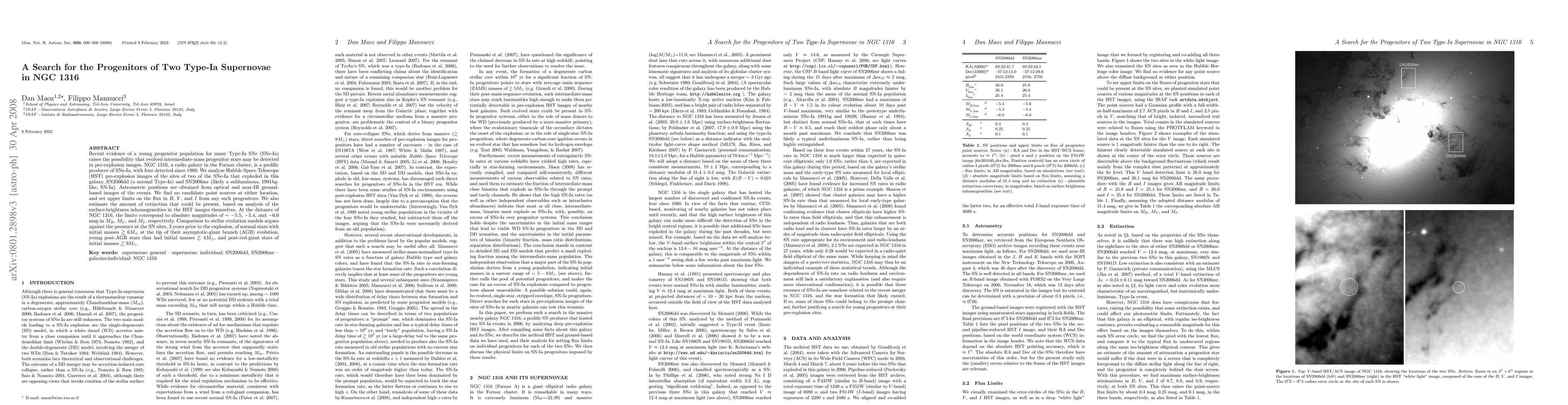 This study uses Hubble Space Telescope images to search for progenitors of two Type-Ia supernovae in NGC 1316, finding no detectable point sources at the explosion sites. The results rule out several types of evolved intermediate-mass stars as progenitors based on the derived upper limits on their brightness.