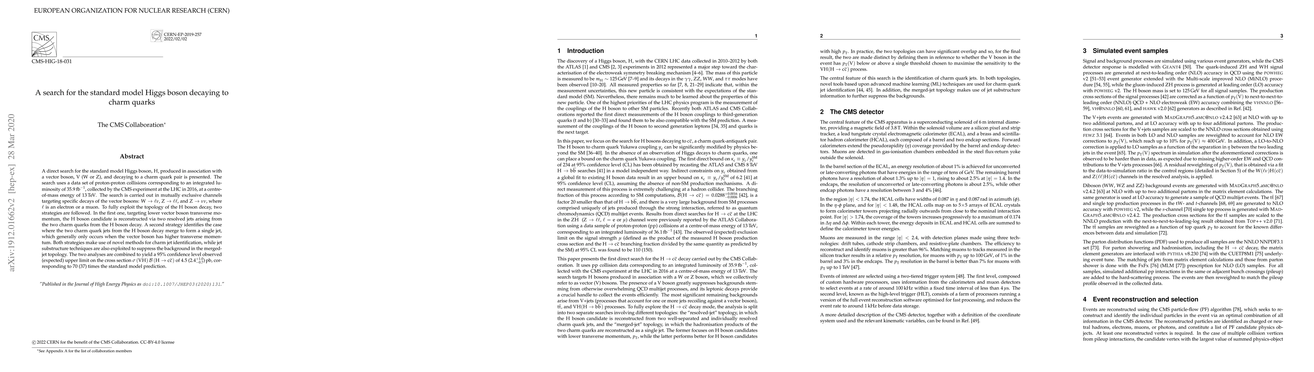A direct search for the standard model Higgs boson, H, produced in association with a vector boson, V (W or Z), and decaying to a charm quark pair is presented. The search uses a data set of proton-proton collisions corresponding to an integrated luminosity of 35.9 fb$^{-1}$, collected by the CMS experiment at the LHC in 2016, at a centre-of-mass energy of 13 TeV. The search is carried out in mutually exclusive channels targeting specific decays of the vector bosons: W $\to$ $\ell \nu$, Z $\to$ $\ell\ell$, and Z $\to$ $\nu\nu$, where $\ell$ is an electron or a muon. To fully exploit the topology of the H boson decay, two strategies are followed. In the first one, targeting lower vector boson transverse momentum, the H boson candidate is reconstructed via two resolved jets arising from the two charm quarks from the H boson decay. A second strategy identifies the case where the two charm quark jets from the H boson decay merge to form a single jet, which generally only occurs when the vector boson has higher transverse momentum. Both strategies make use of novel methods for charm jet identification, while jet substructure techniques are also exploited to suppress the background in the merged-jet topology. The two analyses are combined to yield a 95% confidence level observed (expected) upper limit on the cross section $\sigma$(H) $\mathcal{B}$(H $\to$ $\mathrm{c\bar{c}}$) of 4.5 (2.4 $^{+1.0}_{-0.7}$) pb, corresponding to 70 (37) times the standard model prediction.