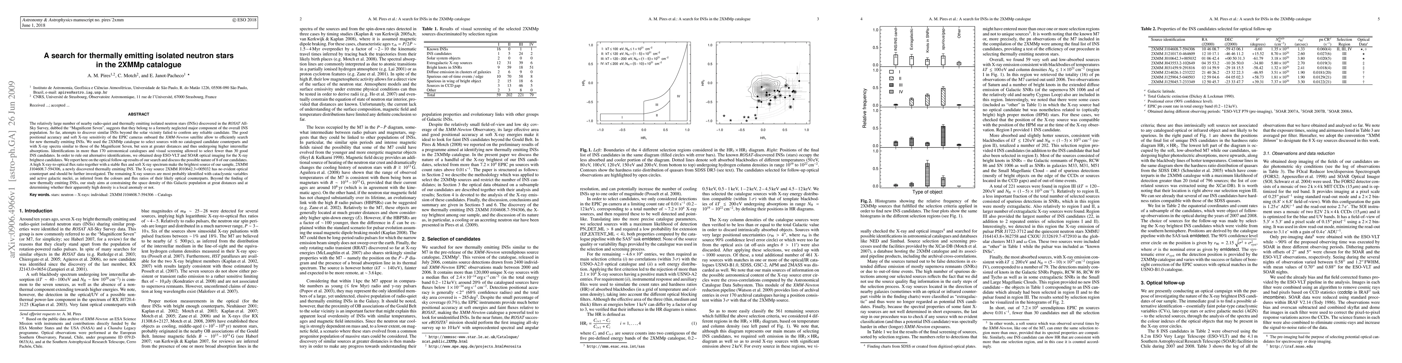The relatively large number of nearby radio-quiet and thermally emitting isolated neutron stars (INSs) discovered in the ROSAT All-Sky Survey, dubbed the ``Magnificent Seven'' (M7), suggests that they belong to a formerly neglected major component of the overall INS population. So far, attempts to discover similar INSs beyond the solar vicinity failed to confirm any reliable candidate. The EPIC cameras onboard the XMM-Newton satellite allow to efficiently search for new thermally emitting INSs. We used the 2XMMp catalogue to select sources with no catalogued candidate counterparts and with X-ray spectra similar to those of the M7, but seen at greater distances and thus undergoing higher interstellar absorptions. Identifications in more than 170 astronomical catalogues and visual screening allowed to select fewer than 30 good INS candidates. In order to rule out alternative identifications, we obtained deep ESO-VLT and SOAR optical imaging for the X-ray brightest candidates. We report here on the optical follow-up results of our search and discuss the possible nature of 8 of our candidates. A high X-ray-to-optical flux ratio together with a stable flux and soft X-ray spectrum make the brightest source of our sample, 2XMM J104608.7-594306, a newly discovered thermally emitting INS. The X-ray source 2XMM J010642.3+005032 has no evident optical counterpart and should be further investigated. The remaining X-ray sources are most probably identified with CVs and AGN, as inferred from the colours and flux ratios of their likely optical counterparts. Beyond the finding of new thermally emitting INSs, our study aims at constraining the space density of this Galactic population at great distances and at determining whether their apparently high density is a local anomaly or not.