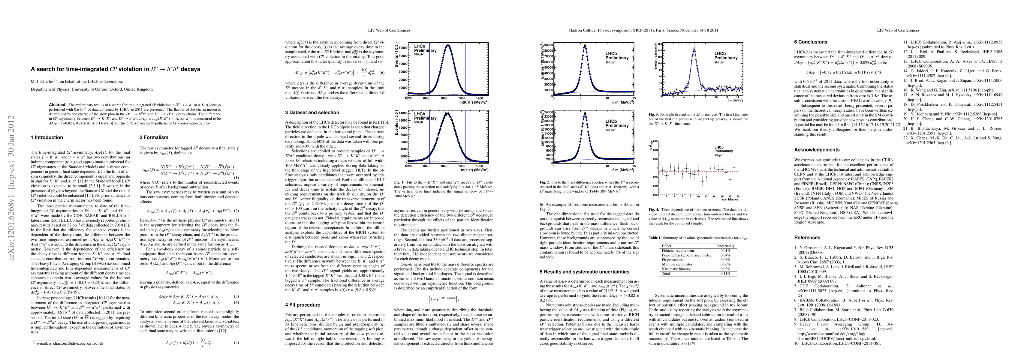 This paper reports preliminary findings from LHCb on a search for time-integrated CP violation in D0 -> h- h+ decays, where h=K or pi. The observed difference in CP asymmetry between D0 -> K- K+ and D0 -> pi- pi+ is Delta ACP = -0.82 ± 0.21 (stat.) ± 0.11 (syst.) %, indicating a 3.5 sigma deviation from CP conservation.