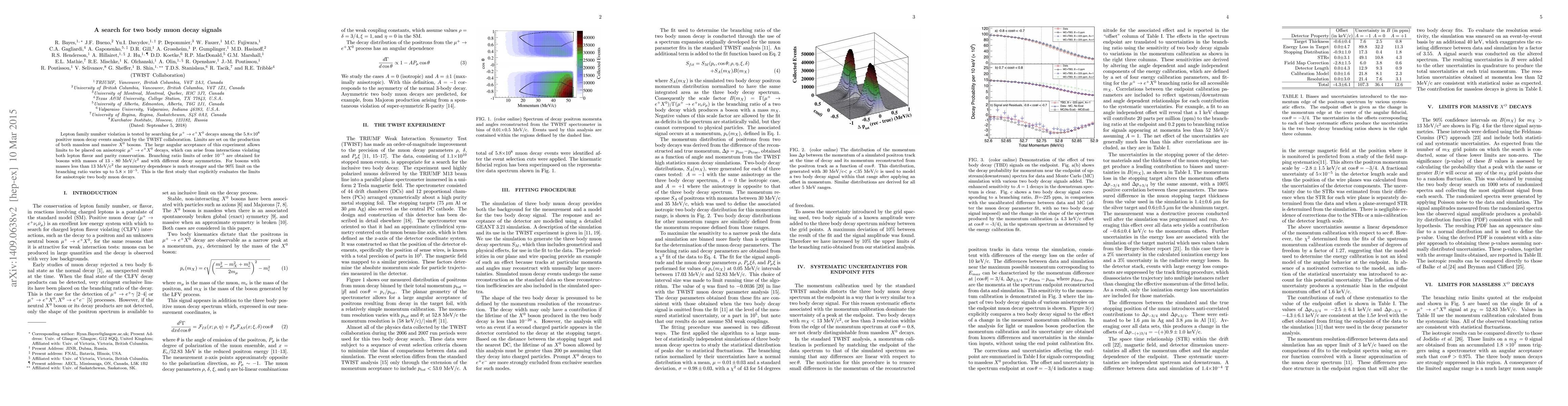 Lepton family number violation is tested by searching for $\mu^+\to e^+X^0$ decays among the 5.8$\times 10^8$ positive muon decay events analyzed by the TWIST collaboration. Limits are set on the production of both massless and massive $X^0$ bosons. The large angular acceptance of this experiment allows limits to be placed on anisotropic $\mu^+\to e^+X^0$ decays, which can arise from interactions violating both lepton flavor and parity conservation. Branching ratio limits of order $10^{-5}$ are obtained for bosons with masses of 13 - 80 MeV/c$^2$ and with different decay asymmetries. For bosons with masses less than 13 MeV/c$^{2}$ the asymmetry dependence is much stronger and the 90% limit on the branching ratio varies up to $5.8 \times 10^{-5}$. This is the first study that explicitly evaluates the limits for anisotropic two body muon decays.