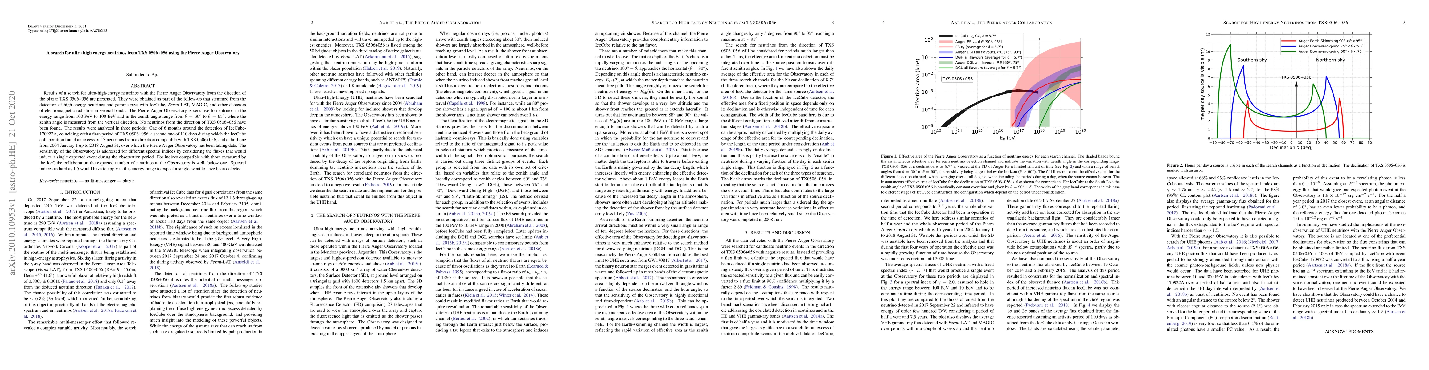 The Pierre Auger Observatory found no ultra-high-energy neutrinos from the blazar TXS 0506+056, despite previous detections of high-energy neutrinos and gamma rays from the same source. The study analyzed data from three periods, including a flare period and a time of excess neutrino detection, but no neutrinos were detected.