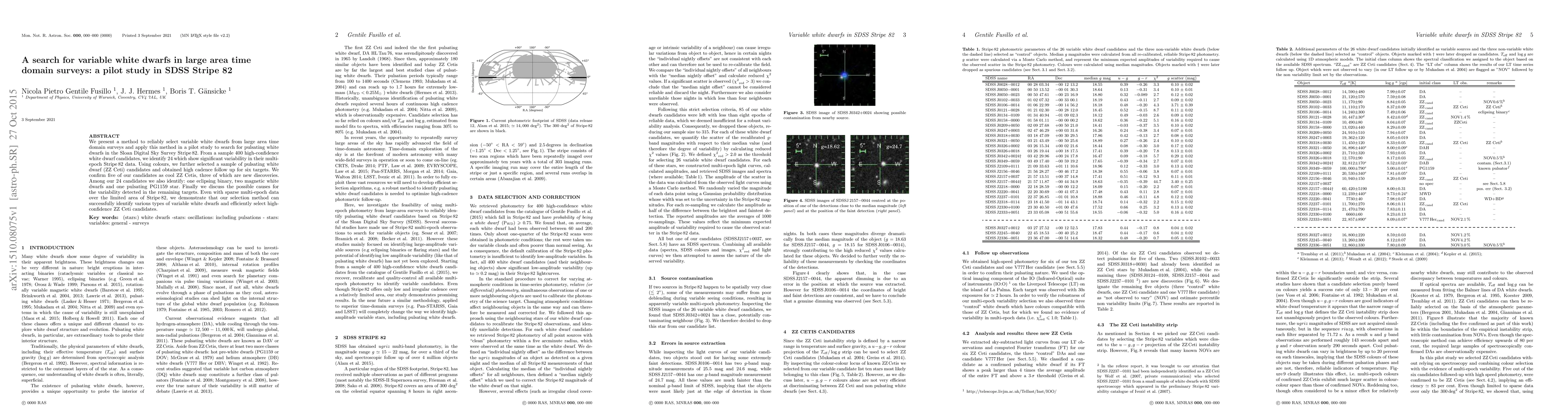 We present a method to reliably select variable white dwarfs from large area time domain surveys and apply this method in a pilot study to search for pulsating white dwarfs in the Sloan Digital Sky Survey Stripe 82. From a sample 400 high-confidence white dwarf candidates, we identify 24 which show significant variability in their multi-epoch Stripe 82 data. Using colours, we further selected a sample of pulsating white dwarf (ZZ Ceti) candidates and obtained high cadence follow up for six targets. We confirm five of our candidates as cool ZZ Cetis, three of which are new discoveries. Among our 24 candidates we also identify: one eclipsing binary, two magnetic white dwarfs and one pulsating PG1159 star. Finally we discuss the possible causes for the variability detected in the remaining targets. Even with sparse multi-epoch data over the limited area of Stripe 82, we demonstrate that our selection method can successfully identify various types of variable white dwarfs and efficiently select high-confidence ZZ Ceti candidates.