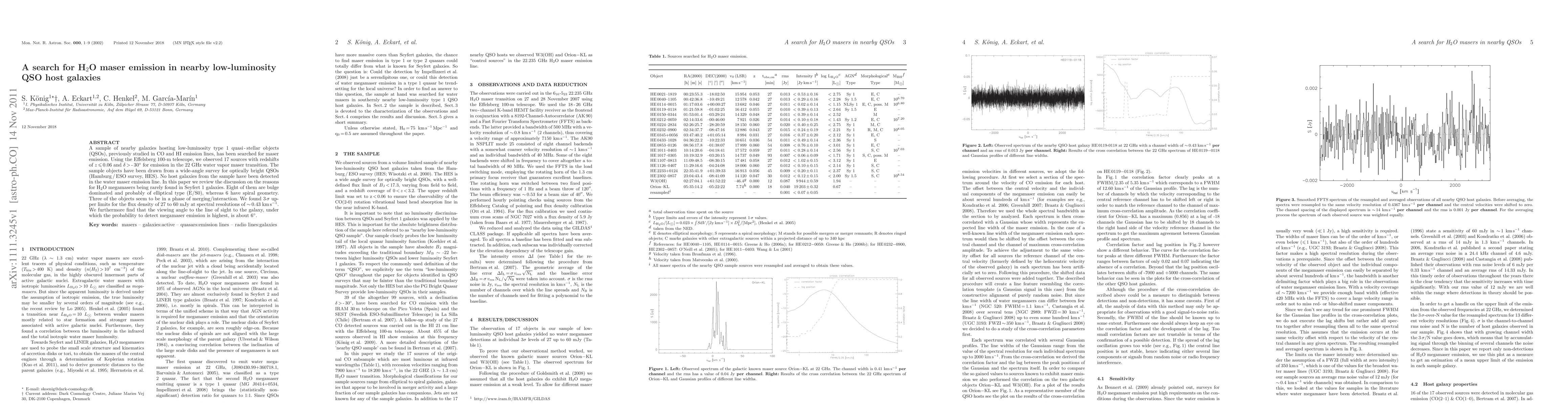 A sample of nearby galaxies hosting low-luminosity type 1 quasi-stellar objects (QSOs), previously studied in CO and HI emission lines, has been searched for maser emission. Using the Effelsberg 100-m telescope, we observed 17 sources with redshifts of z<0.06 and {\delta}>-30{\deg} for emission in the 22 GHz water vapor maser transition. The sample objects have been drawn from a wide-angle survey for optically bright QSOs (Hamburg /ESO survey, HES). No host galaxies from the sample have been detected in the water maser emission line. In this paper we review the discussion on the reasons for water megamasers being rarely found in Seyfert 1 galaxies. Eight of them are bulge dominated and probably of elliptical type (E/S0), whereas 6 have spiral geometry. Three of the objects seem to be in a phase of merging/interaction. We found 3{\sigma} upper limits for the flux density of 27 to 60 mJy at spectral resolutions of ~0.43 km/s. We furthermore find that the viewing angle to the line of sight to the galaxy, under which the probability to detect megamaser emission is highest, is about 6{\deg}.
