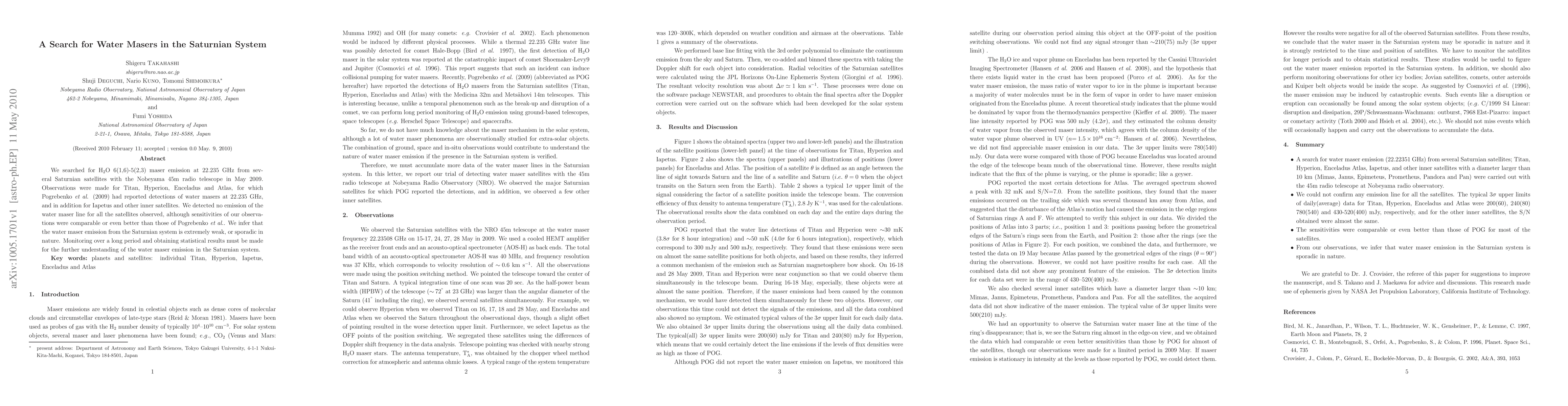 This study used the Nobeyama 45m radio telescope to search for H2O maser emissions at 22.235 GHz from Saturnian satellites, including Titan, Hyperion, Enceladus, Atlas, Iapetus, and others. No water maser emission was detected, suggesting the phenomenon is either extremely weak or sporadic, necessitating long-term monitoring for further understanding.