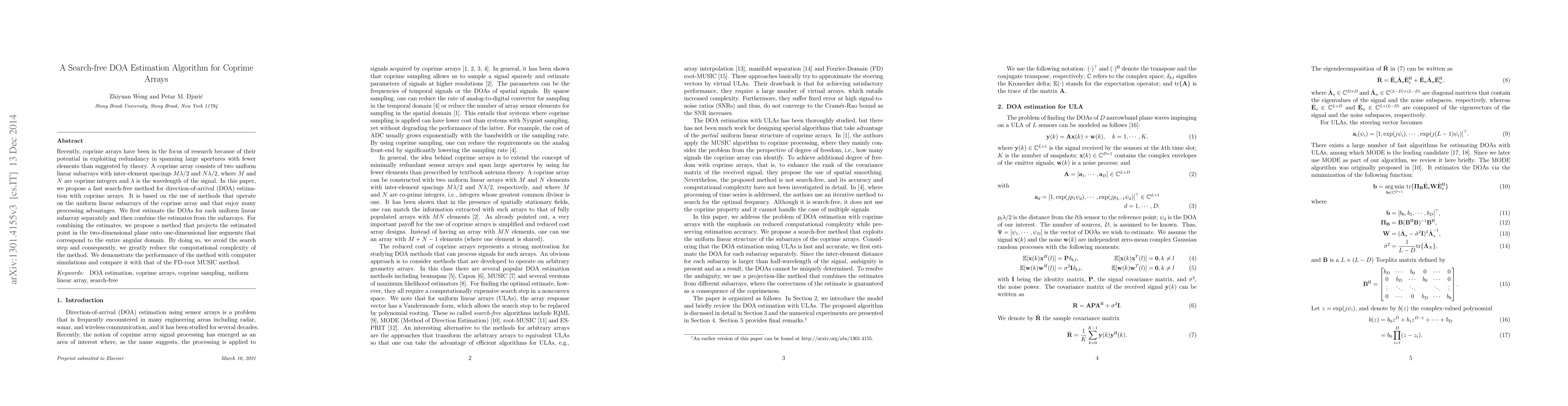 This paper proposes a search-free direction-of-arrival (DOA) estimation algorithm for coprime arrays, which leverages the uniform linear subarrays to avoid computationally intensive search steps. The method estimates DOAs separately for each subarray and combines the results without a search, significantly reducing computational complexity.