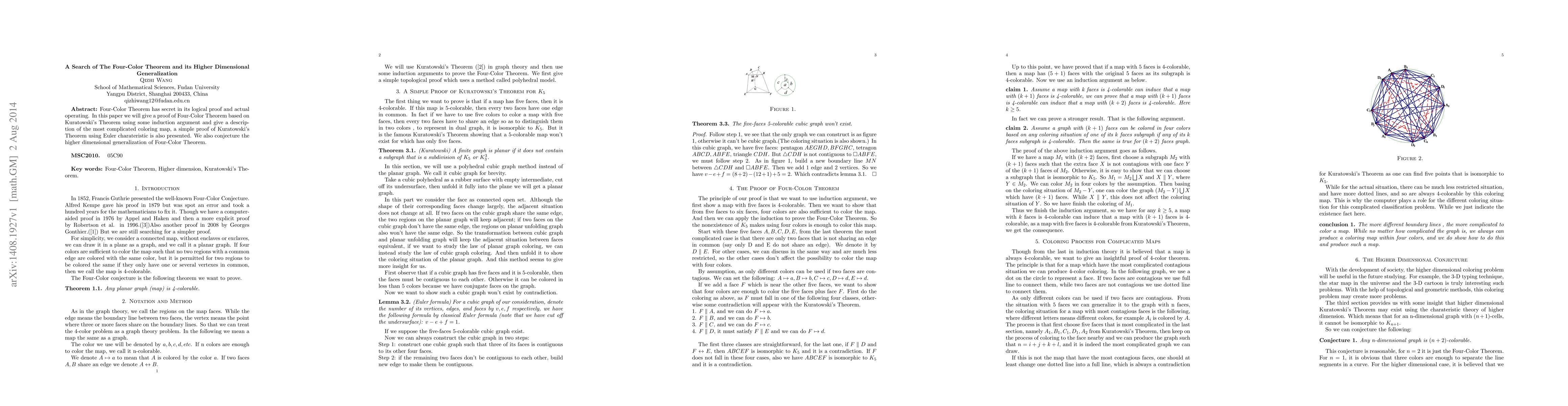 Four-Color Theorem has secret in its logical proof and actual operating. In this paper we will give a proof of Four-Color Theorem based on Kuratowski's Theorem using some induction argument and give a description of the most complicated coloring map, a simple proof of Kuratowski's Theorem using Euler charateristic is also presented. We also conjecture the higher dimensional generalization of Four-Color Theorem.