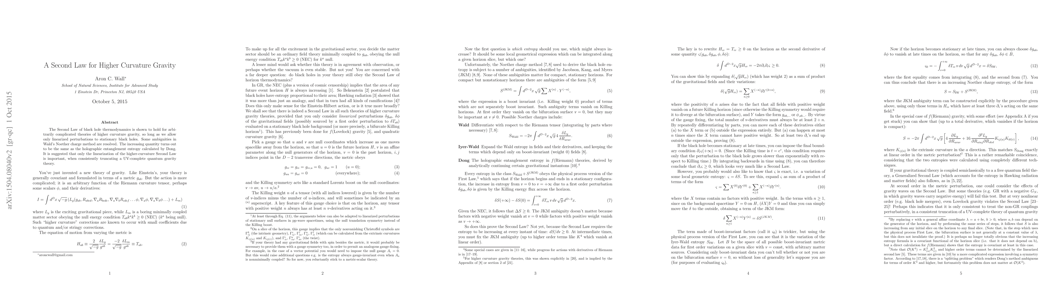 The Second Law of black hole thermodynamics is shown to hold for arbitrarily complicated theories of higher curvature gravity, so long as we allow only linearized perturbations to stationary black holes. Some ambiguities in Wald's Noether charge method are resolved. The increasing quantity turns out to be the same as the holographic entanglement entropy calculated by Dong. It is suggested that only the linearization of the higher-curvature Second Law is important, when consistently truncating a UV-complete quantum gravity theory.