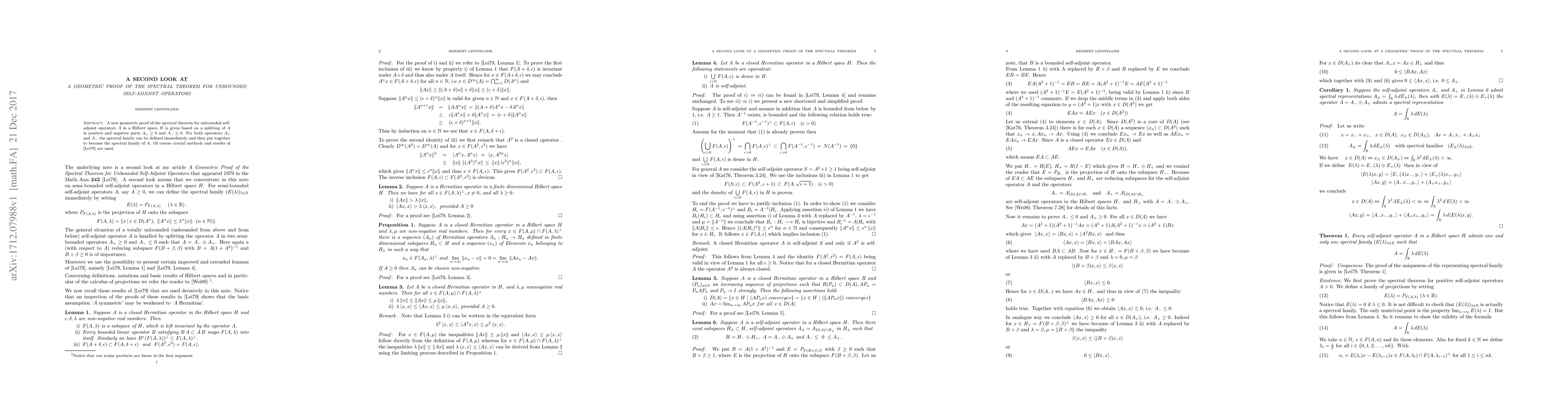 This paper presents a novel geometric proof of the spectral theorem for unbounded self-adjoint operators in Hilbert space, utilizing a decomposition of the operator into positive and negative parts, A+ and A-, to define their spectral families, which are then combined to form the spectral family of the original operator.