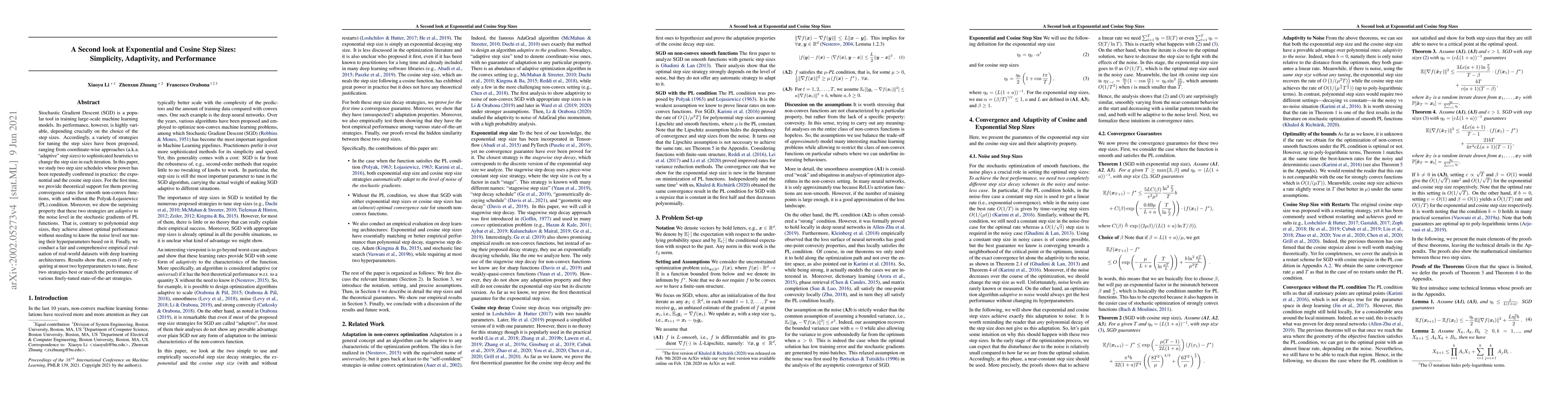 Stochastic Gradient Descent (SGD) is a popular tool in training large-scale machine learning models. Its performance, however, is highly variable, depending crucially on the choice of the step sizes. Accordingly, a variety of strategies for tuning the step sizes have been proposed, ranging from coordinate-wise approaches (a.k.a. ``adaptive'' step sizes) to sophisticated heuristics to change the step size in each iteration. In this paper, we study two step size schedules whose power has been repeatedly confirmed in practice: the exponential and the cosine step sizes. For the first time, we provide theoretical support for them proving convergence rates for smooth non-convex functions, with and without the Polyak-\L{}ojasiewicz (PL) condition. Moreover, we show the surprising property that these two strategies are \emph{adaptive} to the noise level in the stochastic gradients of PL functions. That is, contrary to polynomial step sizes, they achieve almost optimal performance without needing to know the noise level nor tuning their hyperparameters based on it. Finally, we conduct a fair and comprehensive empirical evaluation of real-world datasets with deep learning architectures. Results show that, even if only requiring at most two hyperparameters to tune, these two strategies best or match the performance of various finely-tuned state-of-the-art strategies.
