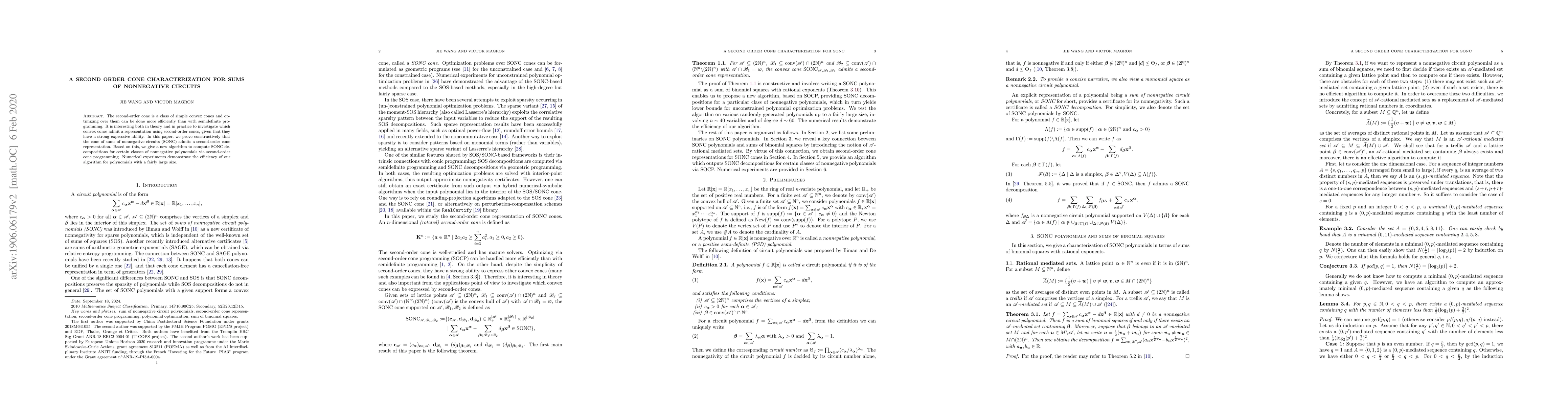 The paper presents a novel second-order cone characterization for sums of nonnegative circuits, along with an algorithm for computing SONC decompositions via second-order cone programming.