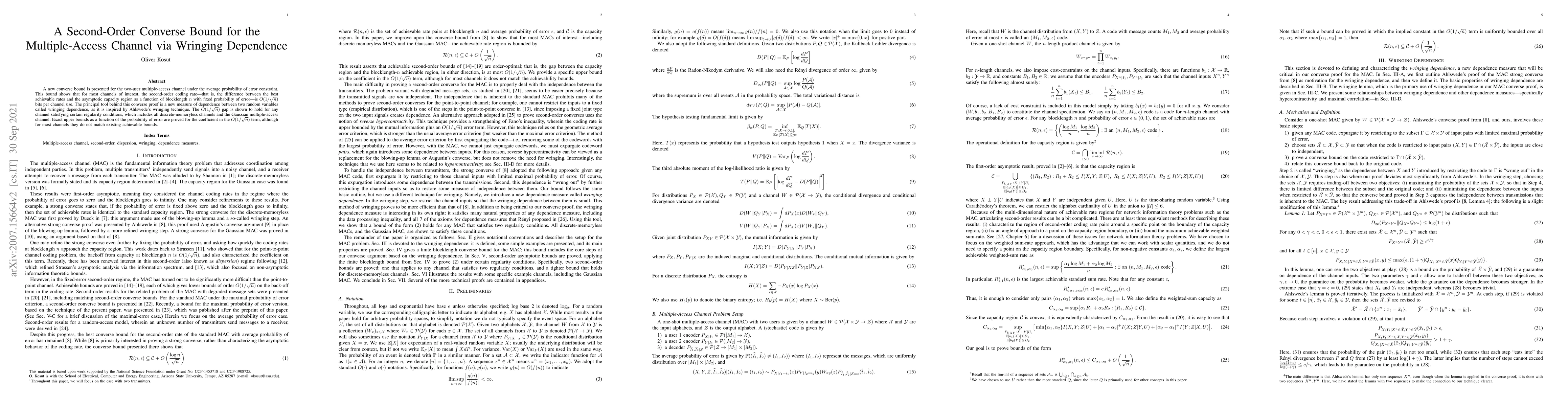 A new converse bound is presented for the two-user multiple-access channel under the average probability of error constraint. This bound shows that for most channels of interest, the second-order coding rate -- that is, the difference between the best achievable rates and the asymptotic capacity region as a function of blocklength $n$ with fixed probability of error -- is $O(1/\sqrt{n})$ bits per channel use. The principal tool behind this converse proof is a new measure of dependence between two random variables called wringing dependence, as it is inspired by Ahlswede's wringing technique. The $O(1/\sqrt{n})$ gap is shown to hold for any channel satisfying certain regularity conditions, which includes all discrete-memoryless channels and the Gaussian multiple-access channel. Exact upper bounds as a function of the probability of error are proved for the coefficient in the $O(1/\sqrt{n})$ term, although for most channels they do not match existing achievable bounds.
