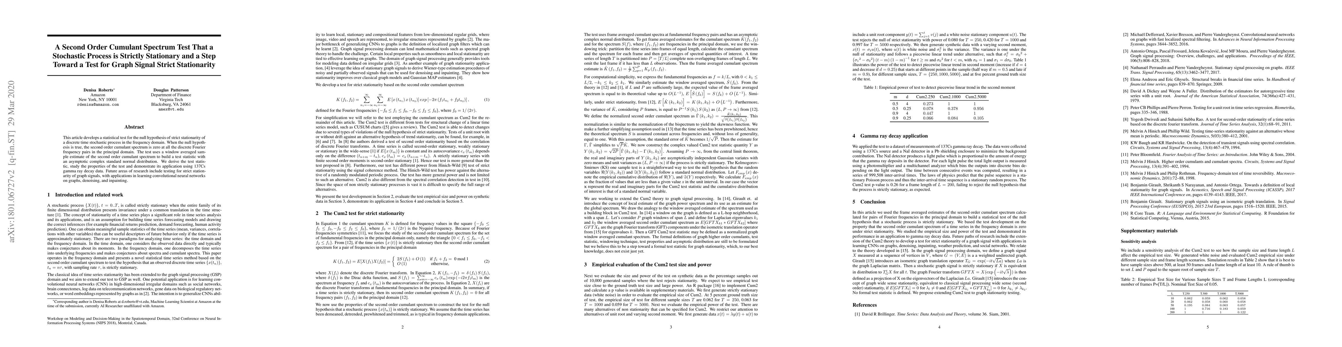 This paper proposes a statistical test for strict stationarity of discrete time stochastic processes based on the second order cumulant spectrum in the frequency domain. The test statistic, derived from a window averaged sample estimate, has an asymptotic complex normal distribution and is demonstrated using 137Cs gamma ray decay data. Future work aims to extend the test to graph signals.