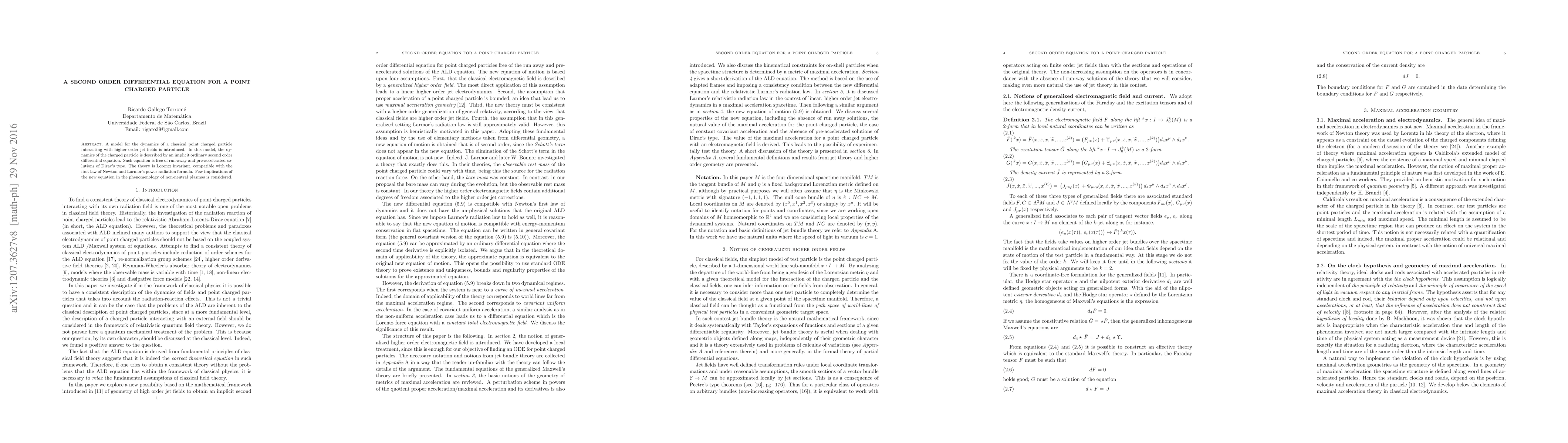 This paper introduces a new second-order differential equation to model the dynamics of a classical point charged particle interacting with higher-order jet fields. The proposed equation avoids Dirac-type solutions and maintains Lorentz invariance, compatibility with Newton's first law, and Larmor's radiation formula, with implications for non-neutral plasmas.
