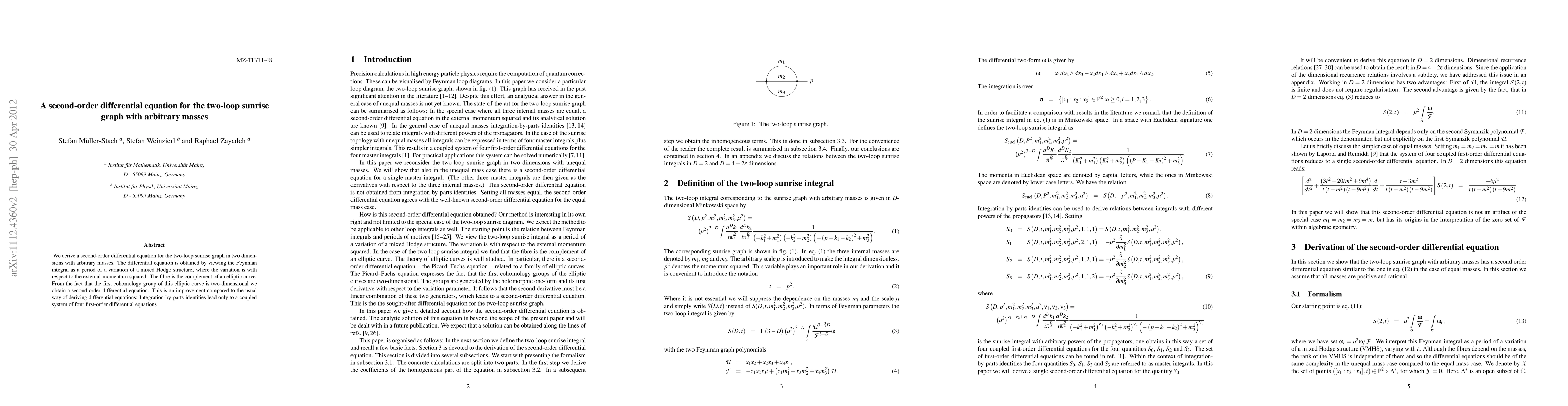 We derive a second-order differential equation for the two-loop sunrise graph in two dimensions with arbitrary masses. The differential equation is obtained by viewing the Feynman integral as a period of a variation of a mixed Hodge structure, where the variation is with respect to the external momentum squared. The fibre is the complement of an elliptic curve. From the fact that the first cohomology group of this elliptic curve is two-dimensional we obtain a second-order differential equation. This is an improvement compared to the usual way of deriving differential equations: Integration-by-parts identities lead only to a coupled system of four first-order differential equations.