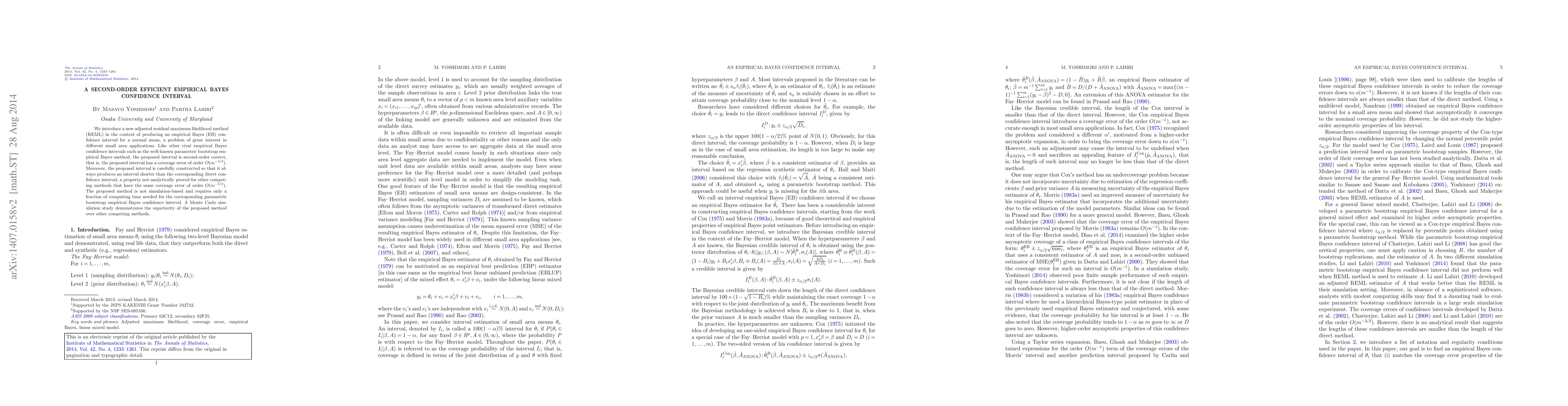 We introduce a new adjusted residual maximum likelihood method (REML) in the context of producing an empirical Bayes (EB) confidence interval for a normal mean, a problem of great interest in different small area applications. Like other rival empirical Bayes confidence intervals such as the well-known parametric bootstrap empirical Bayes method, the proposed interval is second-order correct, that is, the proposed interval has a coverage error of order $O(m^{-{3}/{2}})$. Moreover, the proposed interval is carefully constructed so that it always produces an interval shorter than the corresponding direct confidence interval, a property not analytically proved for other competing methods that have the same coverage error of order $O(m^{-{3}/{2}})$. The proposed method is not simulation-based and requires only a fraction of computing time needed for the corresponding parametric bootstrap empirical Bayes confidence interval. A Monte Carlo simulation study demonstrates the superiority of the proposed method over other competing methods.