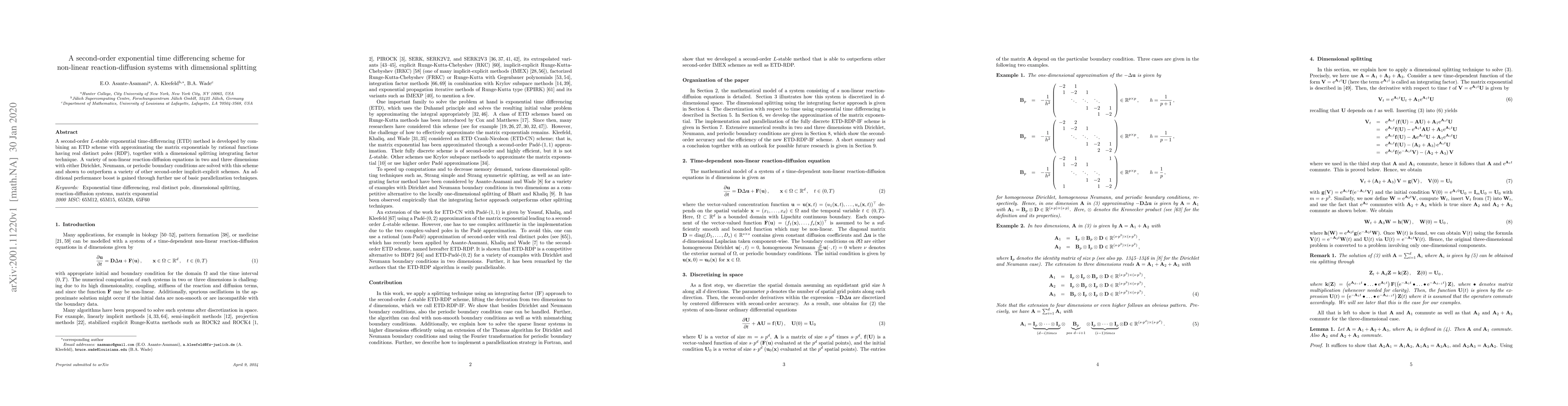 This paper develops a second-order $L$-stable exponential time-differencing (ETD) method for solving non-linear reaction-diffusion systems, employing rational function approximations and dimensional splitting. The method outperforms other second-order implicit-explicit schemes and benefits from parallelization.
