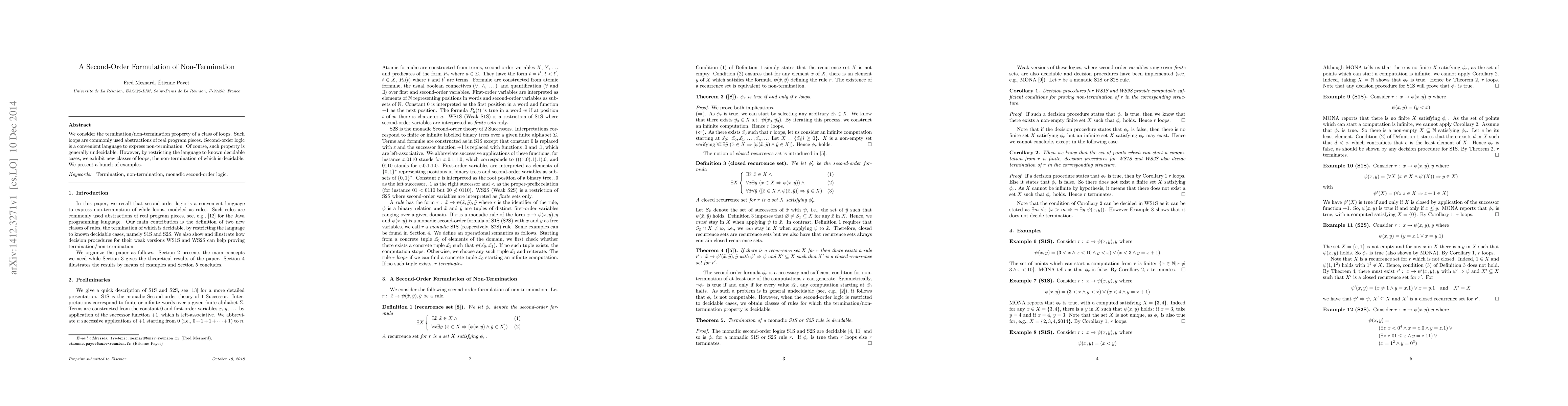 We consider the termination/non-termination property of a class of loops. Such loops are commonly used abstractions of real program pieces. Second-order logic is a convenient language to express non-termination. Of course, such property is generally undecidable. However, by restricting the language to known decidable cases, we exhibit new classes of loops, the non-termination of which is decidable. We present a bunch of examples.