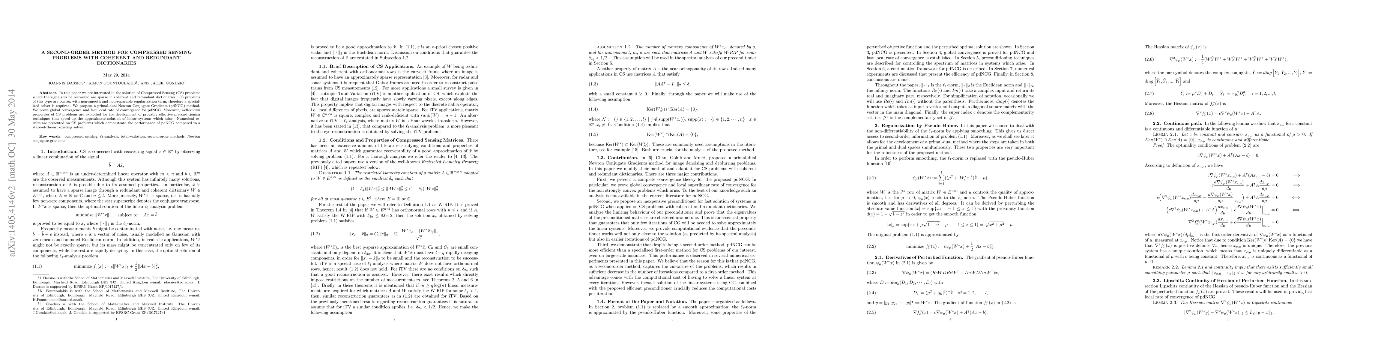 This paper proposes a primal-dual Newton Conjugate Gradients (pdNCG) method for solving compressed sensing problems with sparse signals in coherent and redundant dictionaries. The method demonstrates global convergence and fast local convergence rates, with effective preconditioning techniques enhancing computational efficiency.