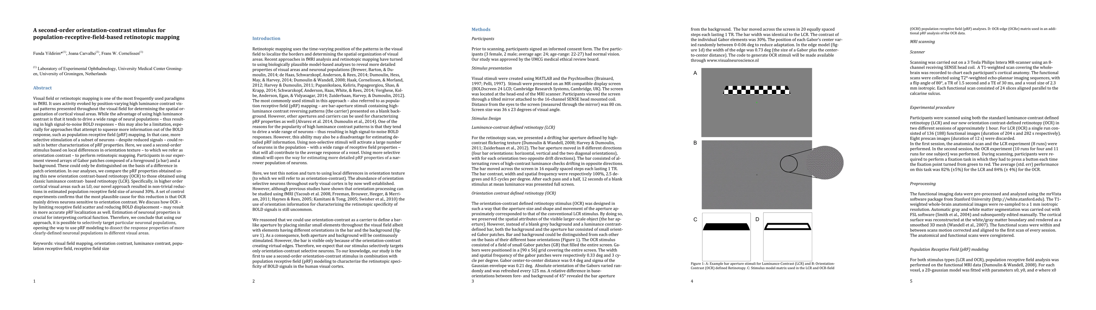 This research introduces a new retinotopic mapping method using second-order orientation-contrast stimuli, which reduces estimated population receptive field size by around 30% in higher visual areas like LO. This approach may enhance pRF localization accuracy and enable the study of more specific neuronal populations.