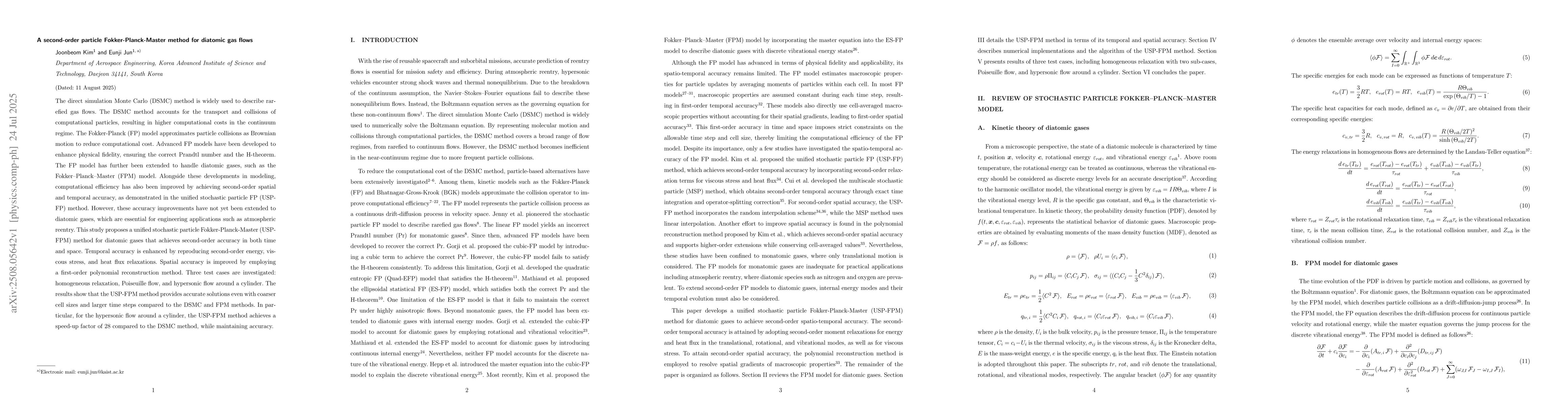 The direct simulation Monte Carlo (DSMC) method is widely used to describe rarefied gas flows. The DSMC method accounts for the transport and collisions of computational particles, resulting in higher computational costs in the continuum regime. The Fokker-Planck (FP) model approximates particle collisions as Brownian motion to reduce computational cost. Advanced FP models have been developed to enhance physical fidelity, ensuring the correct Prandtl number and the H-theorem. The FP model has further been extended to handle diatomic gases, such as the Fokker-Planck-Master (FPM) model. Alongside these developments in modeling, computational efficiency has also been improved by achieving second-order spatial and temporal accuracy, as demonstrated in the unified stochastic particle FP (USP-FP) method. However, these accuracy improvements have not yet been extended to diatomic gases, which are essential for engineering applications such as atmospheric reentry. This study proposes a unified stochastic particle Fokker-Planck-Master (USP-FPM) method for diatomic gases that achieves second-order accuracy in both time and space. Temporal accuracy is enhanced by reproducing second-order energy, viscous stress, and heat flux relaxations. Spatial accuracy is improved by employing a first-order polynomial reconstruction method. Three test cases are investigated: homogeneous relaxation, Poiseuille flow, and hypersonic flow around a cylinder. The results show that the USP-FPM method provides accurate solutions even with coarser cell sizes and larger time steps compared to the DSMC and FPM methods. In particular, for the hypersonic flow around a cylinder, the USP-FPM method achieves a speed-up factor of 28 compared to the DSMC method, while maintaining accuracy.