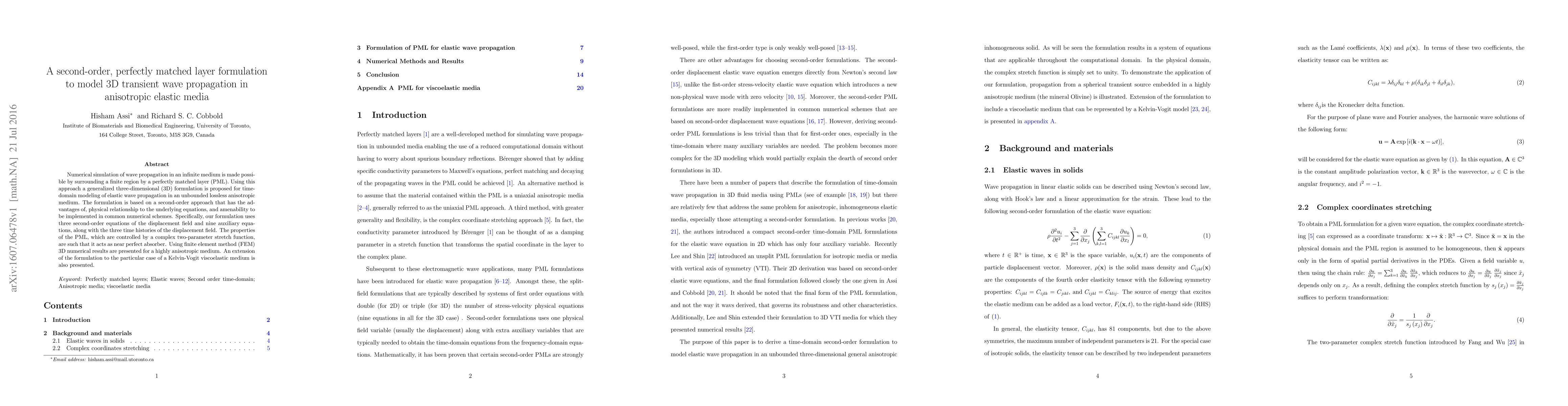 This paper proposes a second-order perfectly matched layer (PML) formulation for 3D transient wave propagation in anisotropic elastic media, enabling accurate numerical simulation of infinite medium wave propagation. The method uses second-order equations and auxiliary equations, demonstrating effective absorption and applicability to both lossless and viscoelastic media.