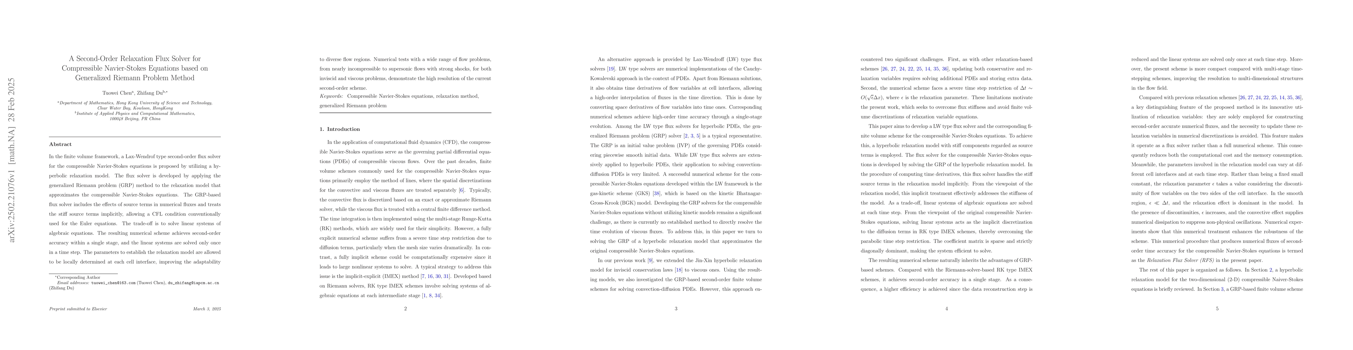 The main technical contribution is the development of a second-order relaxation flux solver for compressible Navier-Stokes equations based on the GRP method, which treats stiff source terms implicitly.