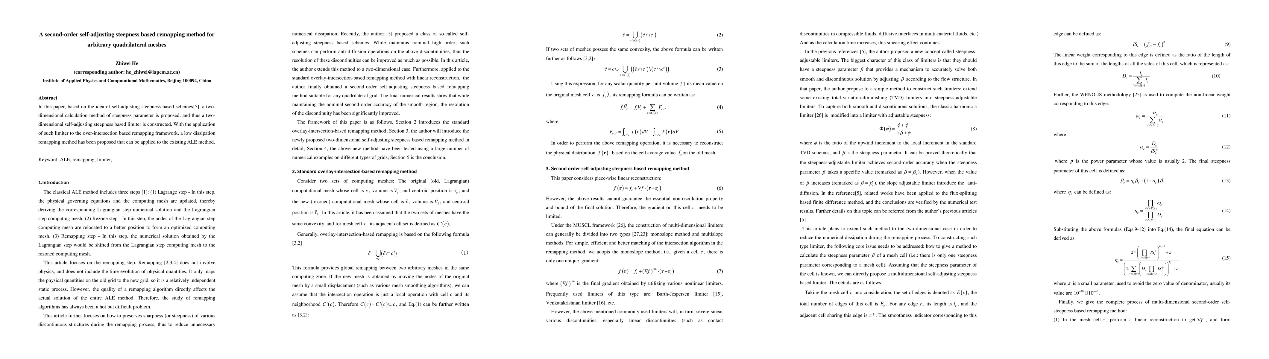 In this paper, based on the idea of self-adjusting steepness based schemes[5], a two-dimensional calculation method of steepness parameter is proposed, and thus a two-dimensional self-adjusting steepness based limiter is constructed. With the application of such limiter to the over-intersection based remapping framework, a low dissipation remapping method has been proposed that can be applied to the existing ALE method.