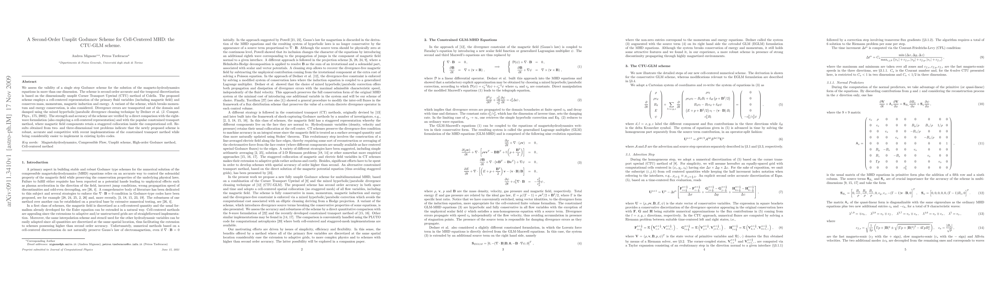 This paper introduces a second-order accurate CTU-GLM scheme for solving magneto-hydrodynamics (MHD) equations in multiple dimensions, employing a cell-centered representation and dimensionally unsplit temporal discretization. The scheme is shown to be robust, accurate, and easier to implement compared to the constrained transport method.