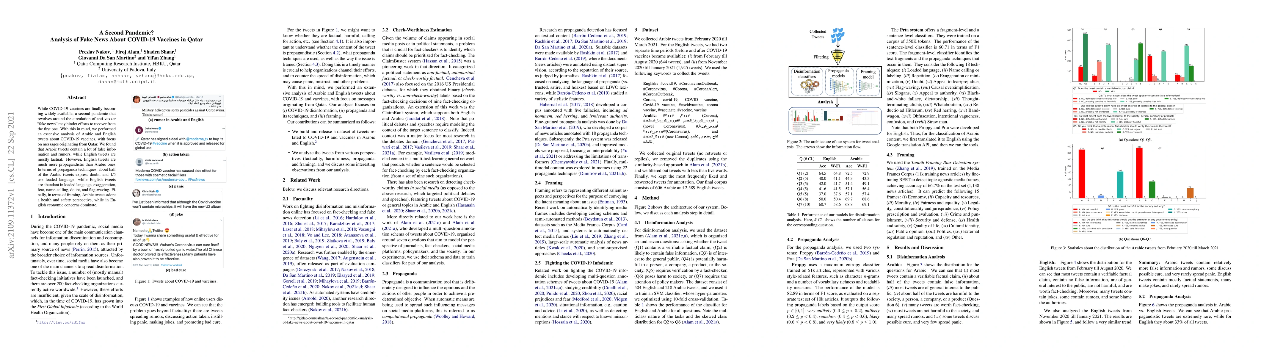 This study analyzes COVID-19 vaccine-related fake news in Qatar, finding significant false information in Arabic tweets and propagandistic tactics in English ones, with English tweets employing loaded language, exaggeration, and fear more frequently than Arabic tweets, which focus on health and safety concerns.