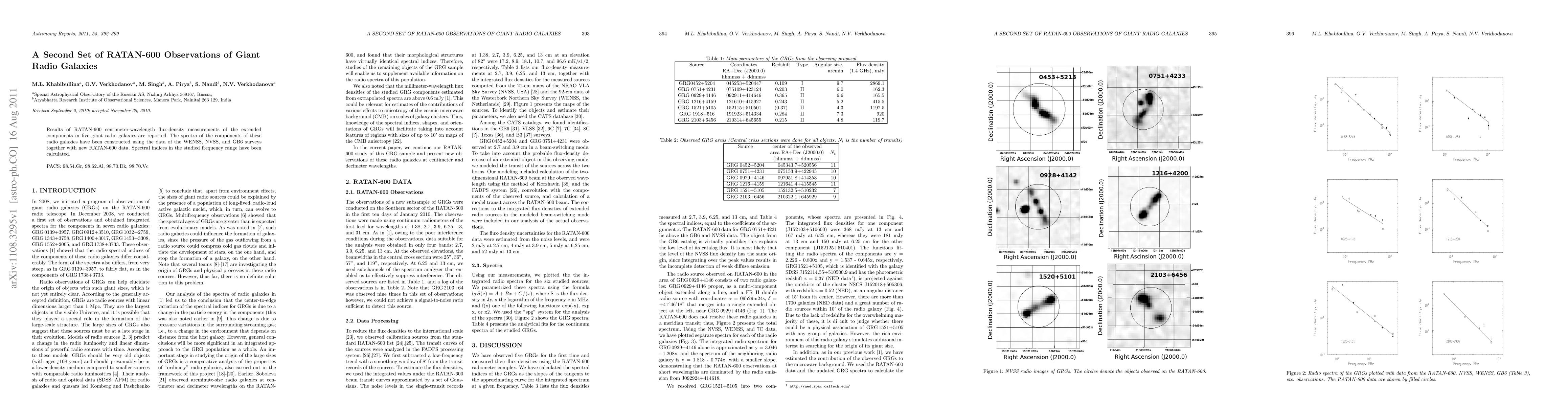 The paper presents detailed centimeter-wavelength flux-density measurements and spectral index calculations for five giant radio galaxies, utilizing data from multiple surveys and RATAN-600 observations.