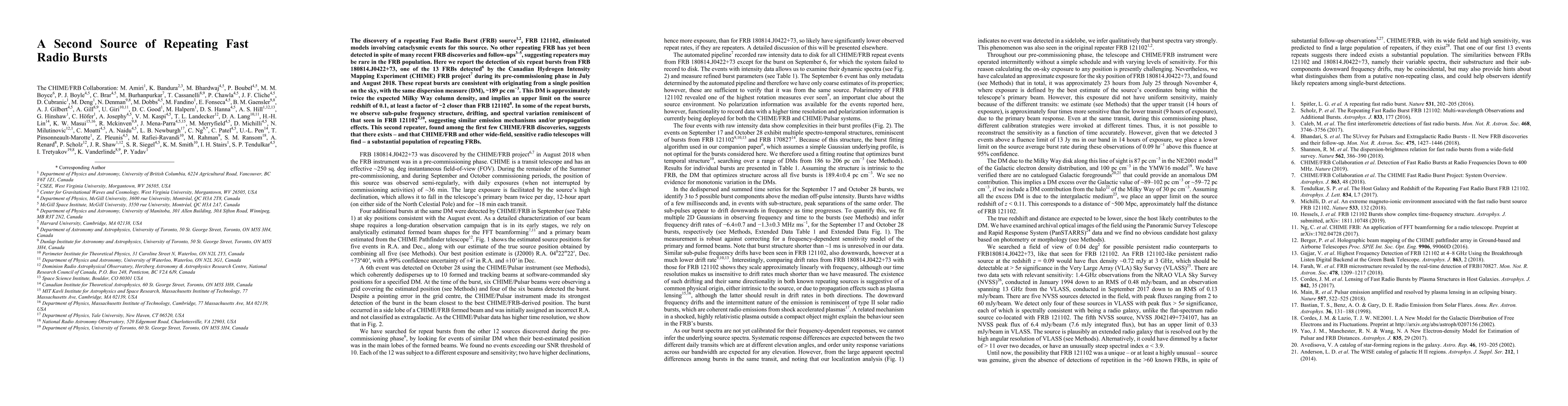 The paper reports the detection of six repeat bursts from FRB 180814.J0422+73, the second known repeating Fast Radio Burst source, suggesting that repeating FRBs may be more common than previously thought. The bursts originate from a single position with similar dispersion measures, indicating similar emission mechanisms and propagation effects as FRB 121102.