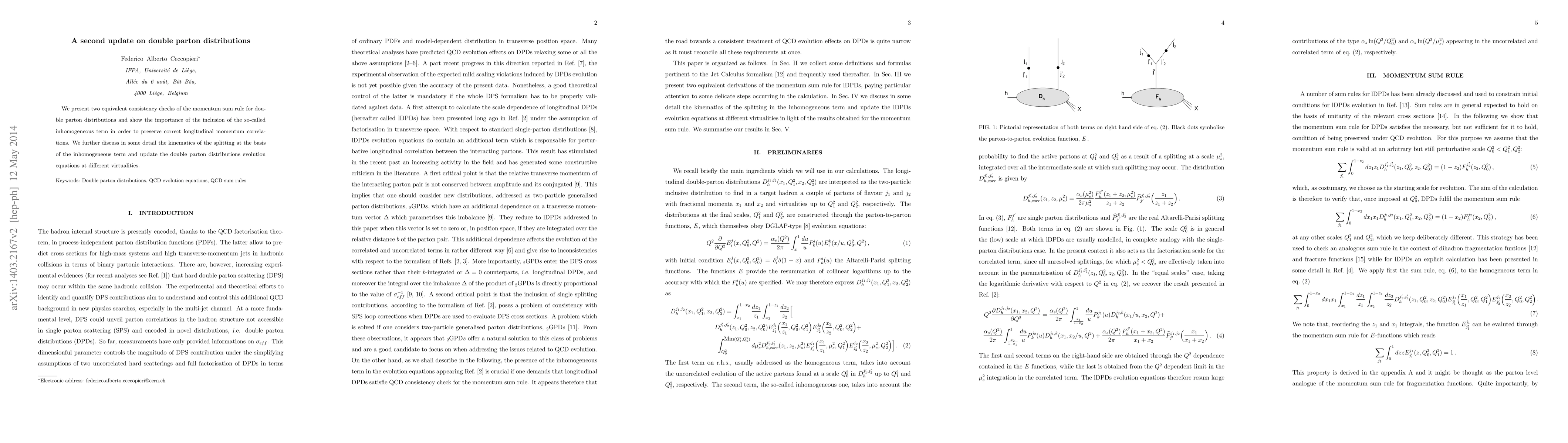 This paper provides consistency checks on double parton distributions, emphasizing the necessity of the inhomogeneous term for accurate longitudinal momentum correlations. It also updates the evolution equations for these distributions at various virtualities.