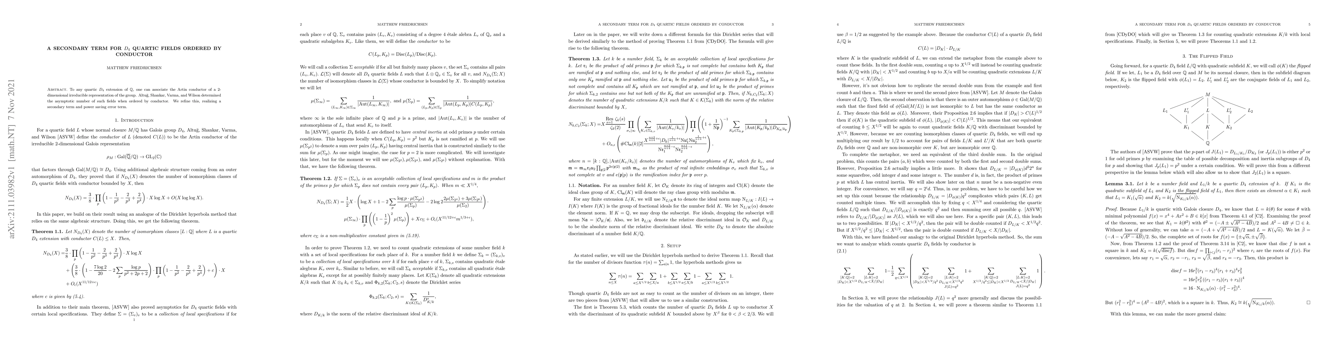 To any quartic $D_4$ extension of $\mathbb{Q}$, one can associate the Artin conductor of a 2-dimensional irreducible representation of the group. Alt\u{u}g, Shankar, Varma, and Wilson determined the asymptotic number of such fields when ordered by conductor. We refine this, realizing a secondary term and power saving error term.
