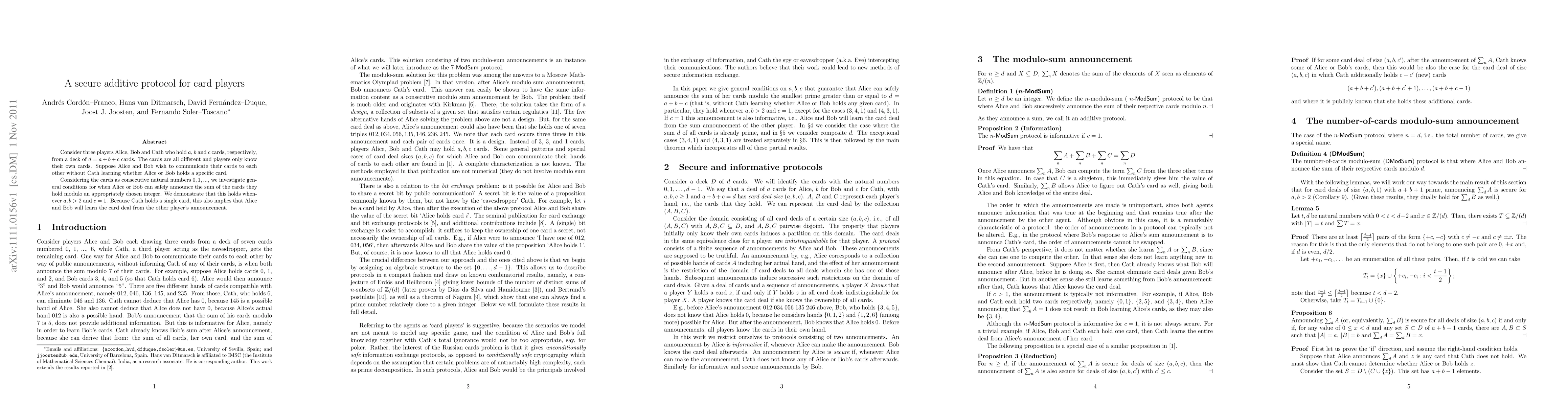 Consider three players Alice, Bob and Cath who hold a, b and c cards, respectively, from a deck of d=a+b+c cards. The cards are all different and players only know their own cards. Suppose Alice and Bob wish to communicate their cards to each other without Cath learning whether Alice or Bob holds a specific card. Considering the cards as consecutive natural numbers 0,1,..., we investigate general conditions for when Alice or Bob can safely announce the sum of the cards they hold modulo an appropriately chosen integer. We demonstrate that this holds whenever a,b>2 and c=1. Because Cath holds a single card, this also implies that Alice and Bob will learn the card deal from the other player's announcement.