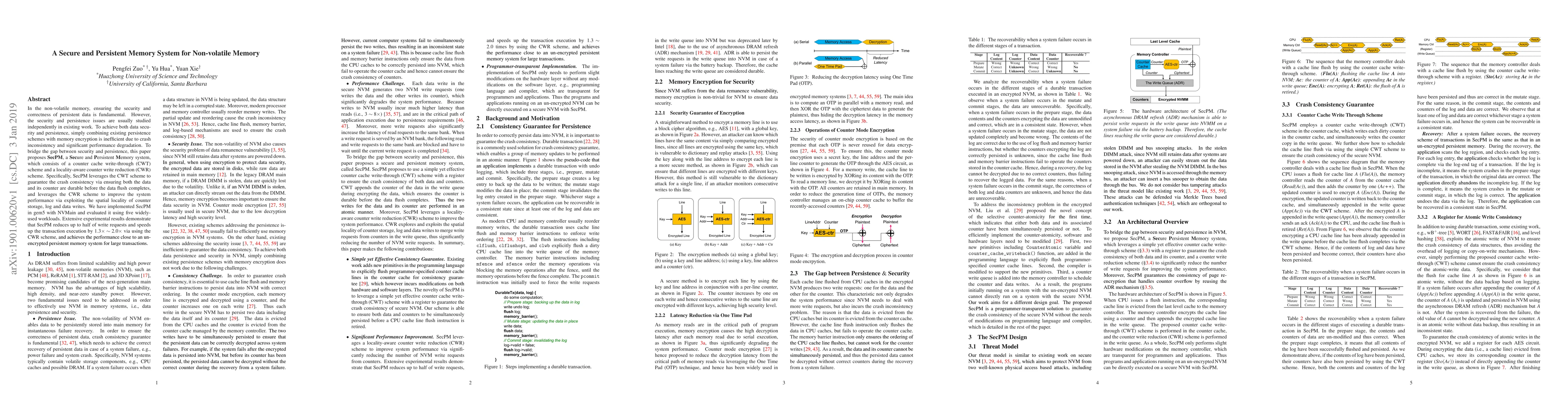 This paper introduces SecPM, a Secure and Persistent Memory system addressing both security and persistence in non-volatile memory. It combines a counter cache write-through scheme for crash consistency and a locality-aware counter write reduction scheme to improve performance, achieving significant reductions in write requests and transaction speeds.