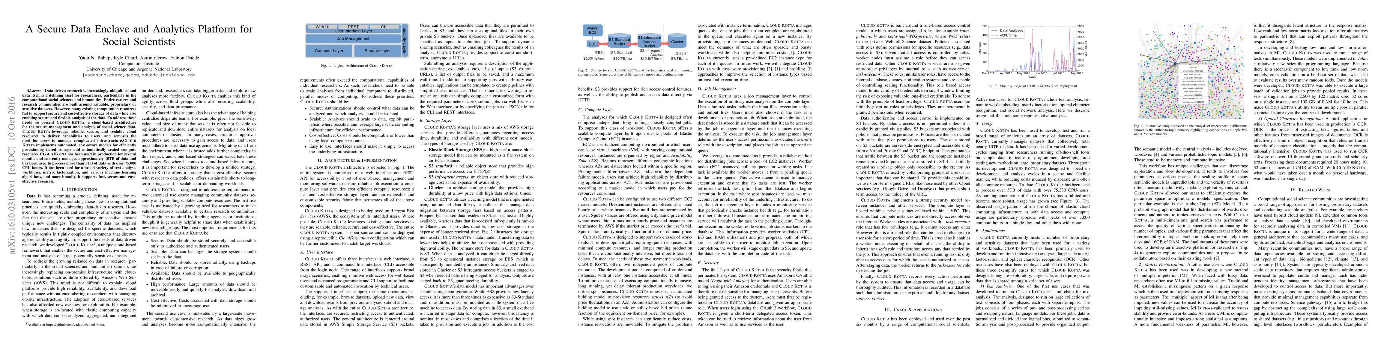 The paper introduces CLOUD KOTTA, a cloud-based platform for secure management and analysis of social science data, addressing the need for secure, cost-effective storage and flexible data analysis. It has been operational for several months, managing 10TB of data and supporting diverse analytical workflows.