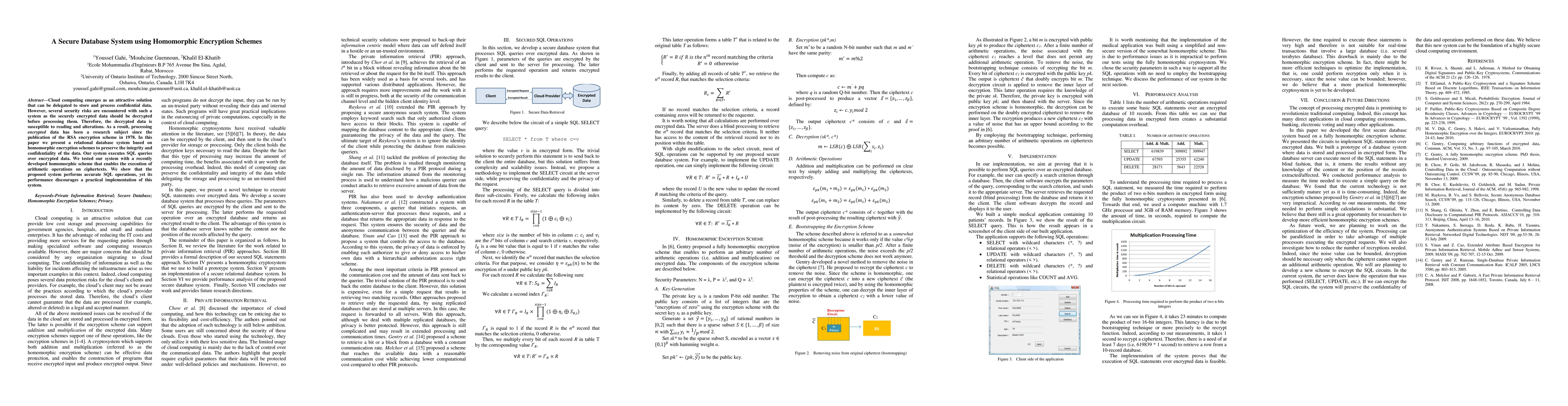 This paper proposes a secure relational database system using homomorphic encryption to protect data confidentiality and integrity in cloud storage. While the system successfully performs SQL queries on encrypted data, its performance limitations hinder practical implementation.