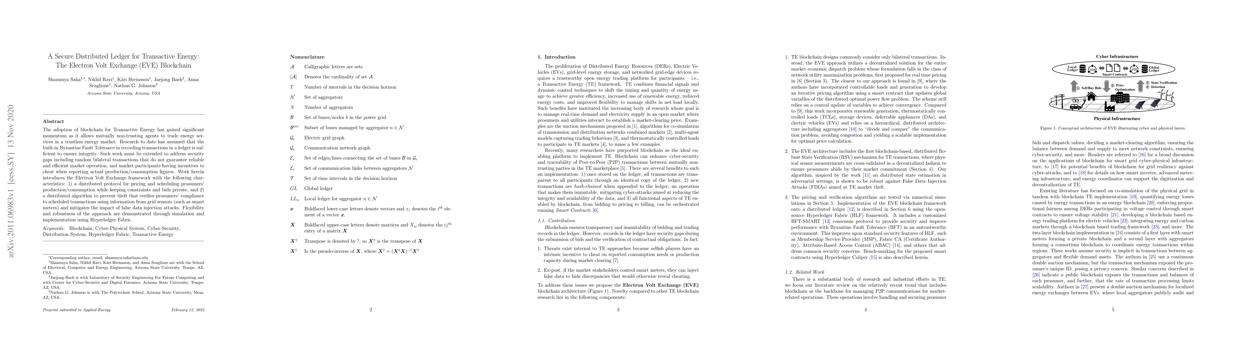 The adoption of blockchain for Transactive Energy has gained significant momentum as it allows mutually non-trusting agents to trade energy services in a trustless energy market. Research to date has assumed that the built-in Byzantine Fault Tolerance in recording transactions in a ledger is sufficient to ensure integrity. Such work must be extended to address security gaps including random bilateral transactions that do not guarantee reliable and efficient market operation, and market participants having incentives to cheat when reporting actual production/consumption figures. Work herein introduces the Electron Volt Exchange framework with the following characteristics: 1) a distributed protocol for pricing and scheduling prosumers' production/consumption while keeping constraints and bids private, and 2) a distributed algorithm to prevent theft that verifies prosumers' compliance to scheduled transactions using information from grid sensors (such as smart meters) and mitigates the impact of false data injection attacks. Flexibility and robustness of the approach are demonstrated through simulation and implementation using Hyperledger Fabric.